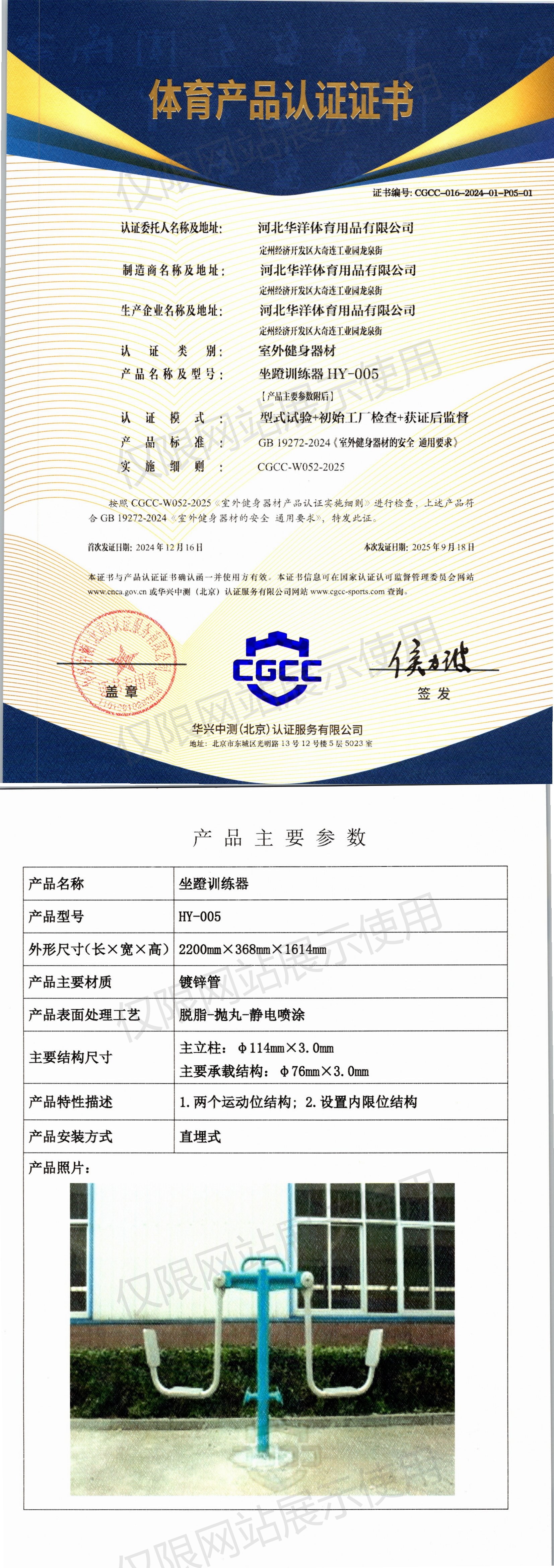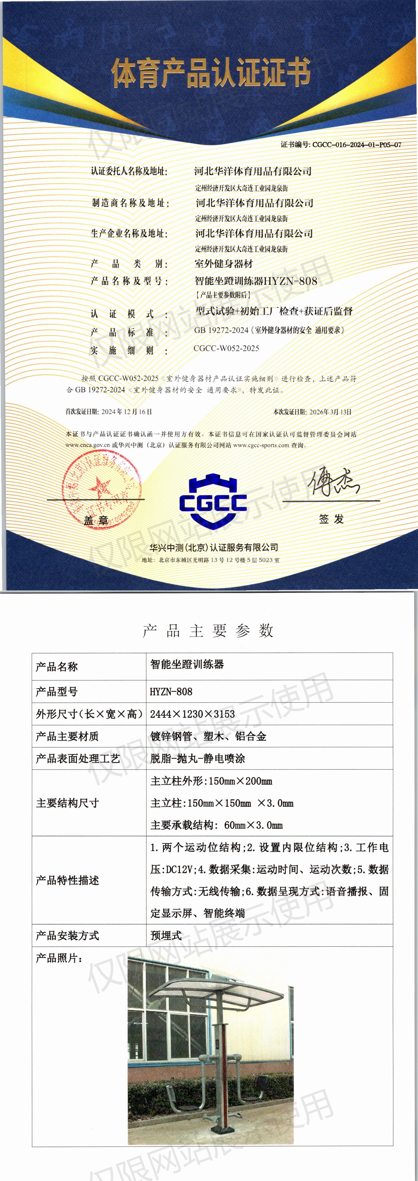 | 9 | 河北华洋体育用品有限公司 | CGCC-016-2024-01-P05-07 | 智能坐蹬训练器 | HYZN-808 | 定州经济开发区大奇连工业园龙泉街 | GB 19272-2024 | 2024-12-16 | 有效 | 查看 |