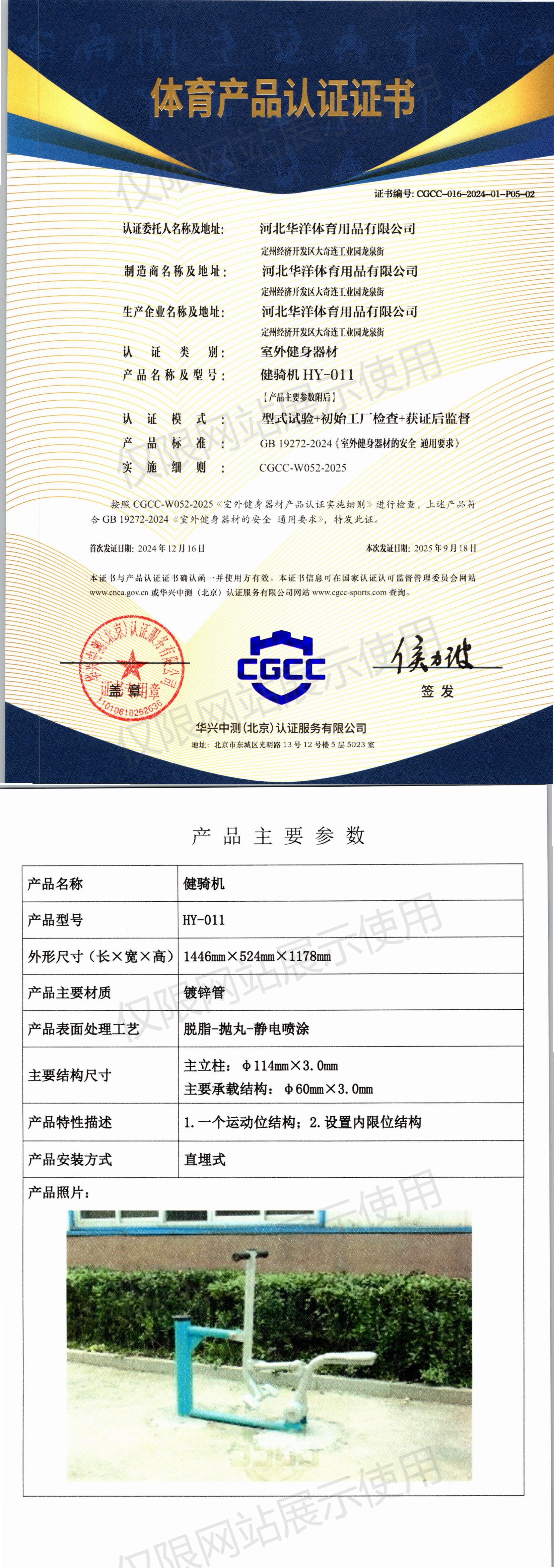 | 4 | 河北华洋体育用品有限公司 | CGCC-016-2024-01-P05-02 | 健骑机 | HY-011 | 定州经济开发区大奇连工业园龙泉街 | GB 19272-2024 | 2024-12-16 | 有效 | 查看 |
