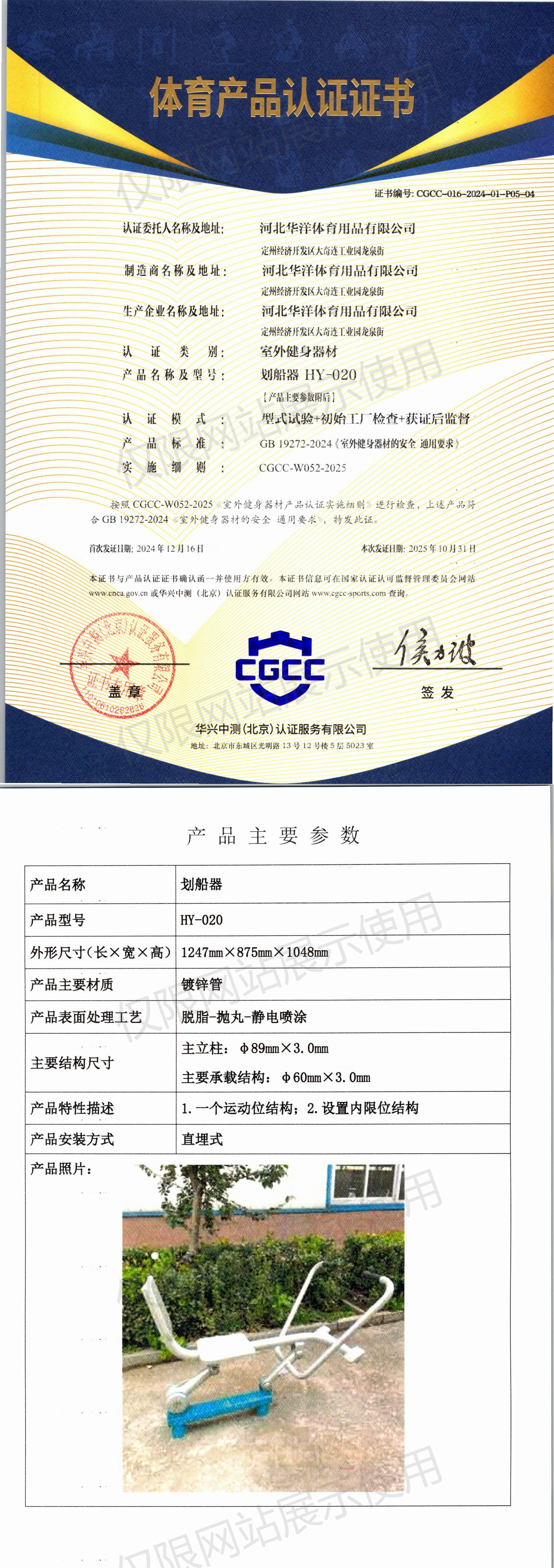 | 6 | 河北华洋体育用品有限公司 | CGCC-016-2024-01-P05-04 | 划船器 | HY-020 | 定州经济开发区大奇连工业园龙泉街 | GB 19272-2024 | 2024-12-16 | 有效 | 查看 |