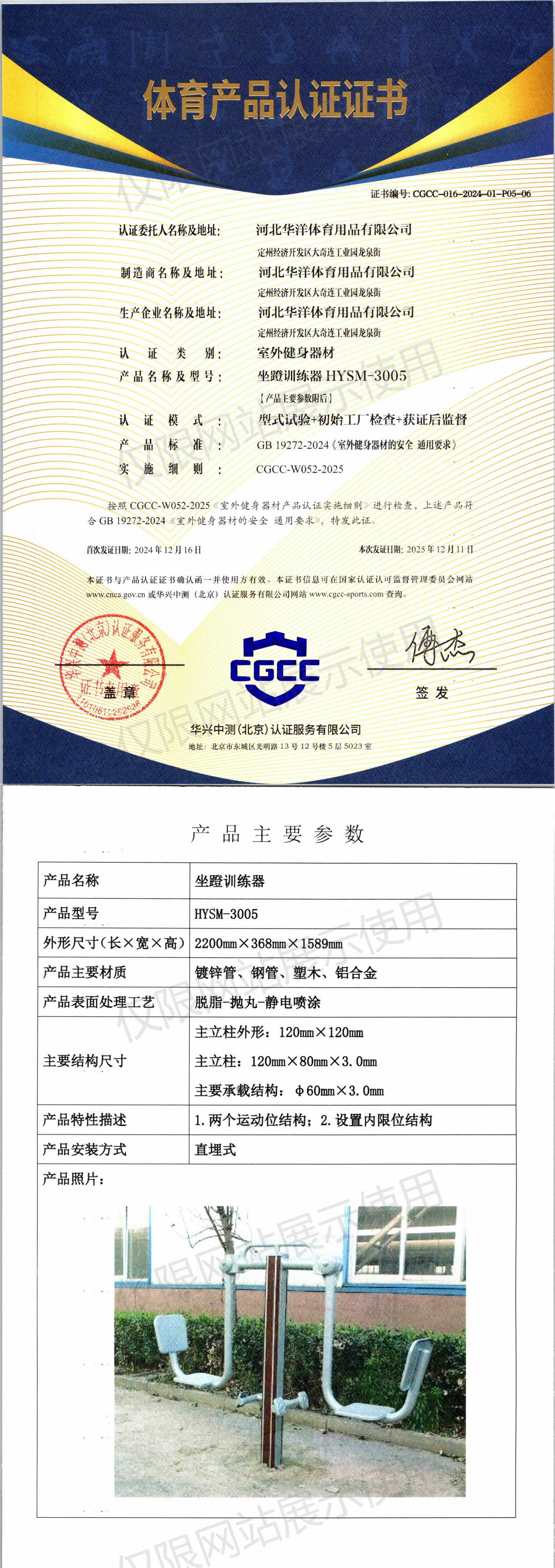 | 8 | 河北华洋体育用品有限公司 | CGCC-016-2024-01-P05-06 | 坐蹬训练器 | HYSM-3005 | 定州经济开发区大奇连工业园龙泉街 | GB 19272-2024 | 2024-12-16 | 有效 | 查看 |