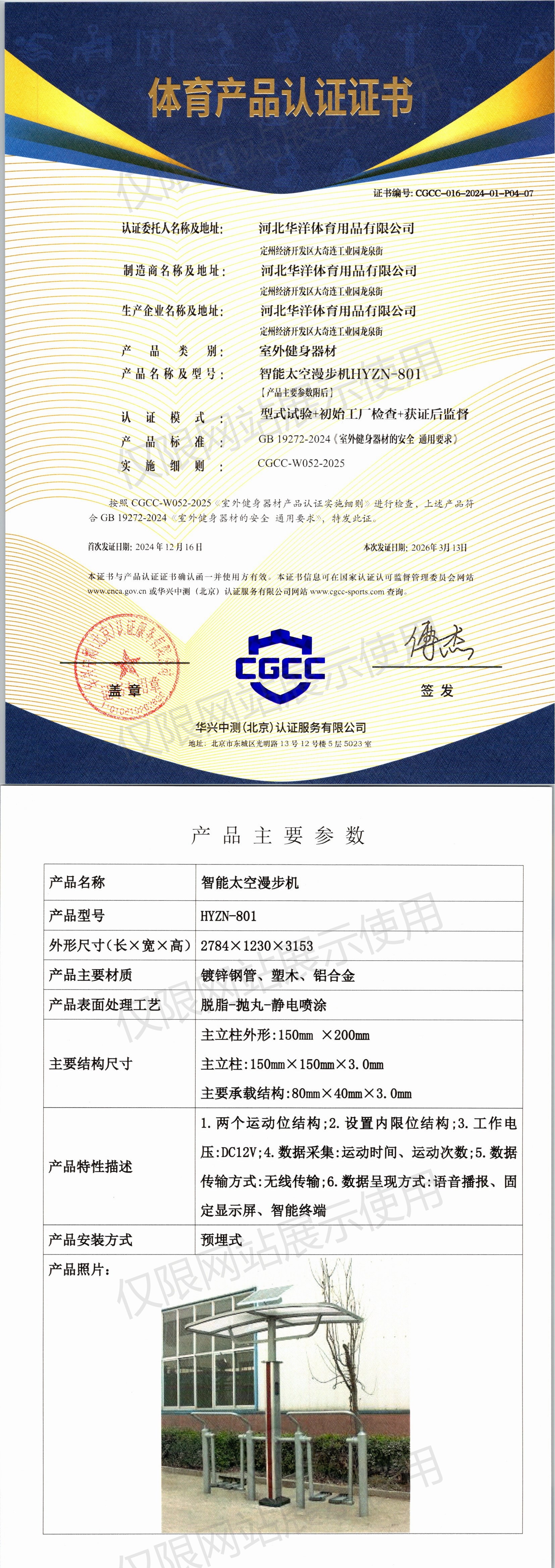 | 1 | 河北华洋体育用品有限公司 | CGCC-016-2024-01-P04-07 | 智能太空漫步机 | HYZN-801 | 定州经济开发区大奇连工业园龙泉街 | GB 19272-2024 | 2024-12-16 | 有效 | 查看 |