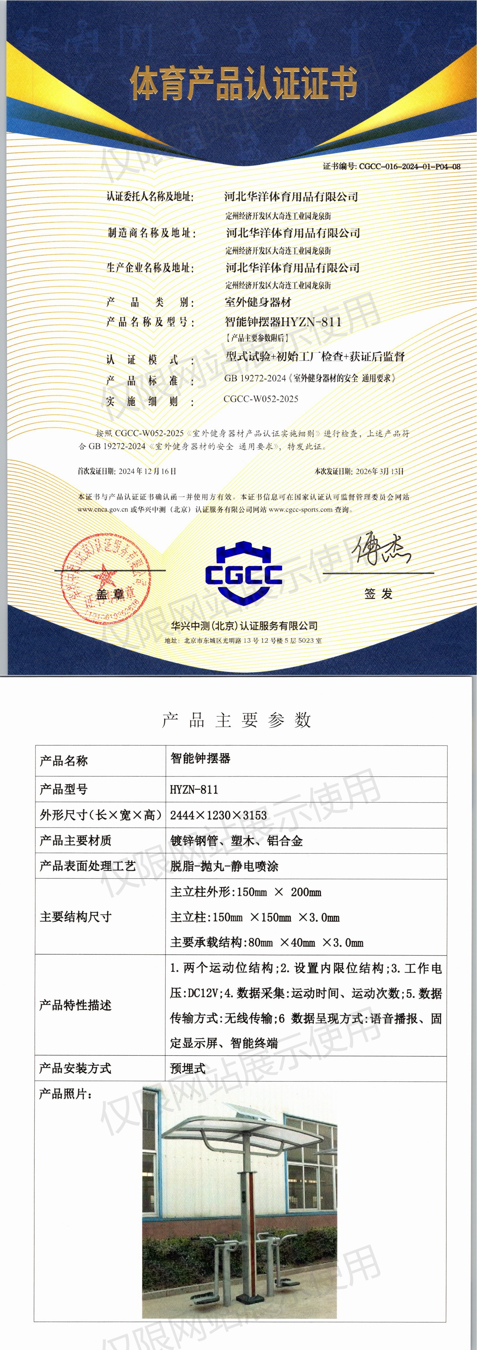 | 2 | 河北华洋体育用品有限公司 | CGCC-016-2024-01-P04-08 | 智能钟摆器 | HYZN-811 | 定州经济开发区大奇连工业园龙泉街 | GB 19272-2024 | 2024-12-16 | 有效 | 查看 |