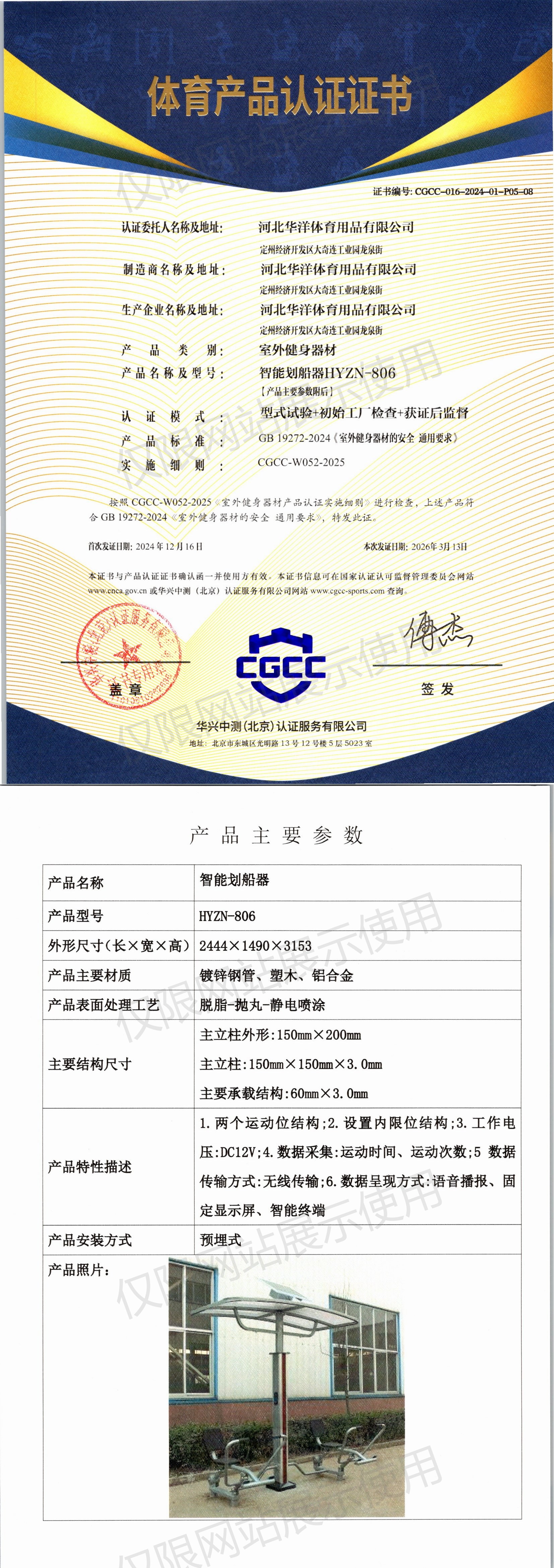 | 10 | 河北华洋体育用品有限公司 | CGCC-016-2024-01-P05-08 | 智能划船器 | HYZN-806 | 定州经济开发区大奇连工业园龙泉街 | GB 19272-2024 | 2024-12-16 | 有效 | 查看 |