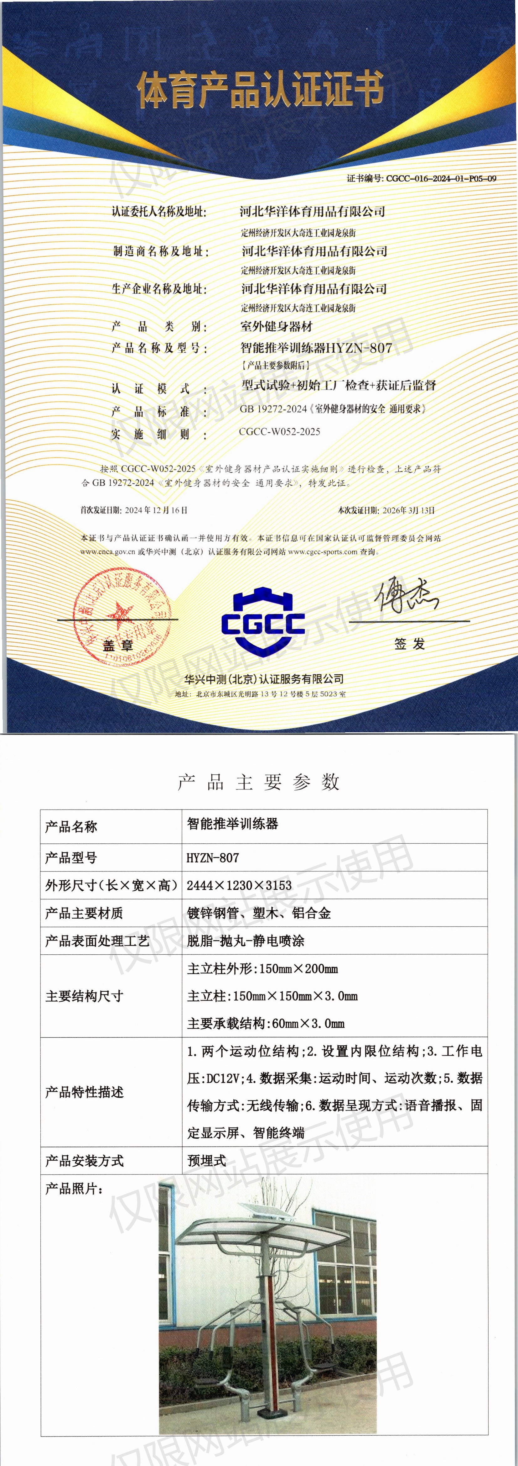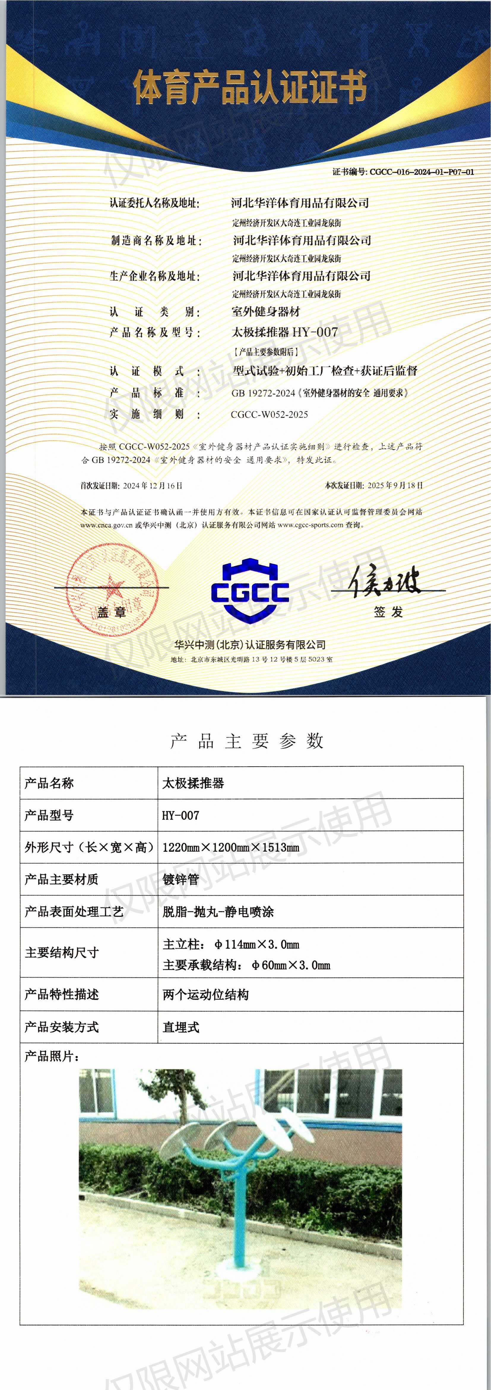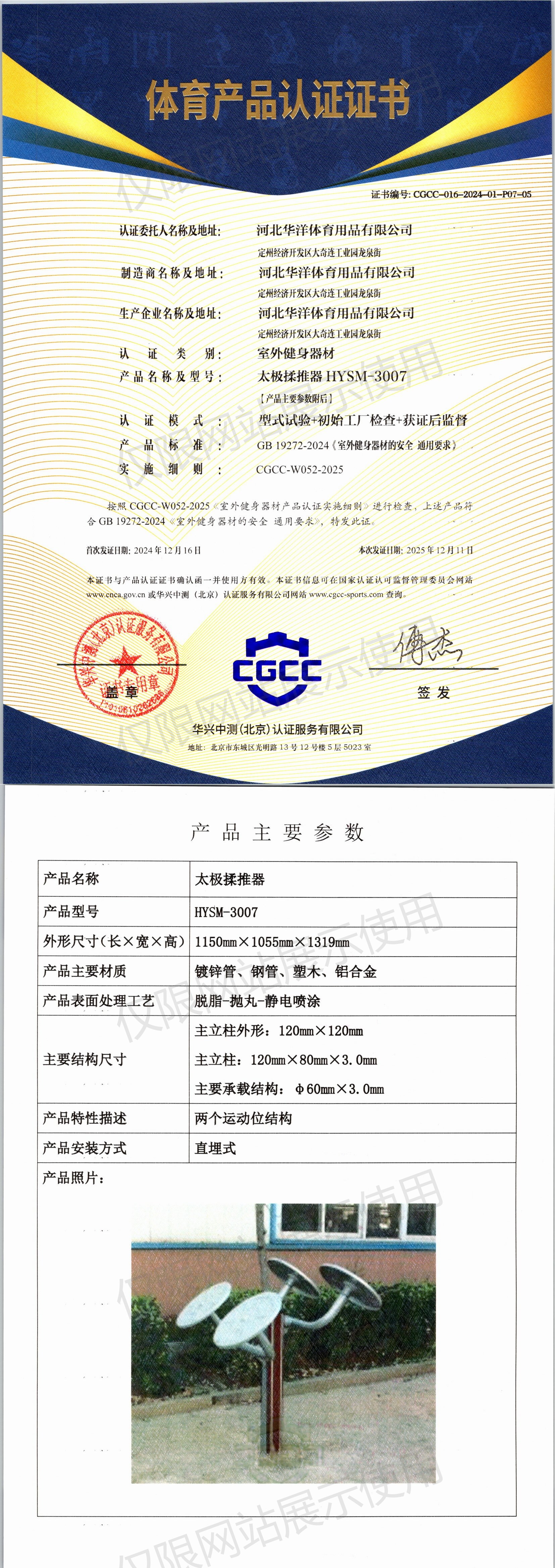 | 6 | 河北华洋体育用品有限公司 | CGCC-016-2024-01-P07-01 | 太极揉推器 | HY-007 | 定州经济开发区大奇连工业园龙泉街 | GB 19272-2024 | 2024-12-16 | 有效 | 查看 |