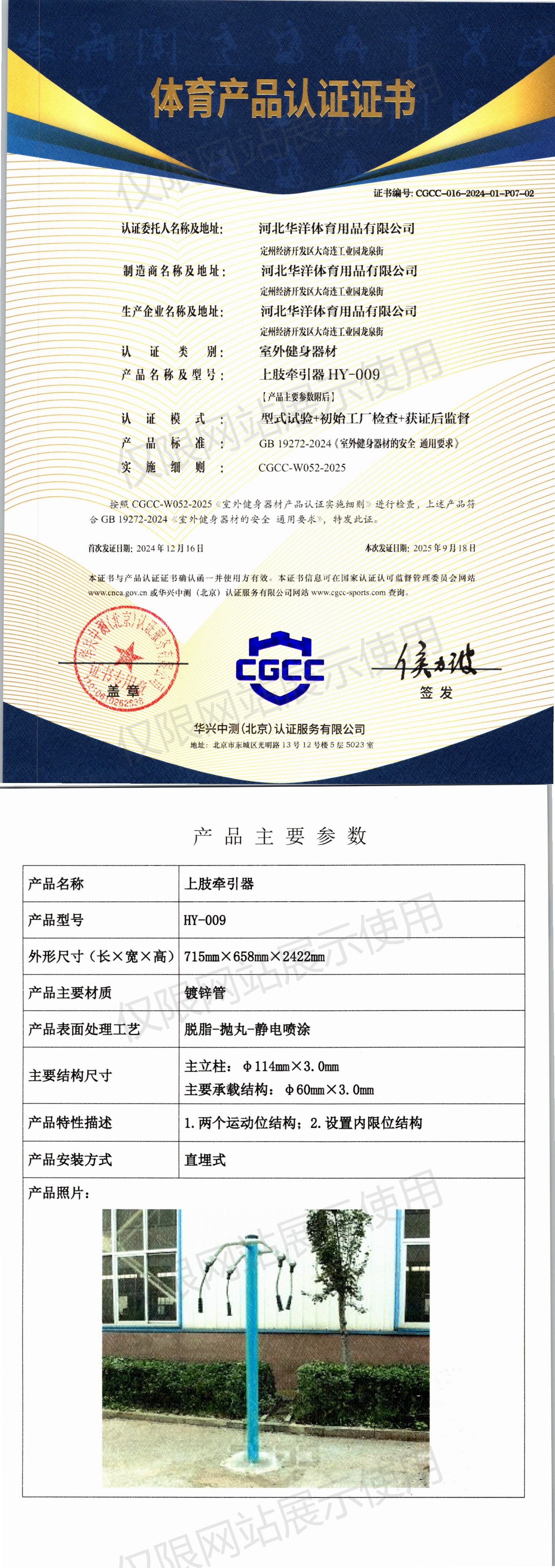 | 7 | 河北华洋体育用品有限公司 | CGCC-016-2024-01-P07-02 | 上肢牵引器 | HY-009 | 定州经济开发区大奇连工业园龙泉街 | GB 19272-2024 | 2024-12-16 | 有效 | 查看 |