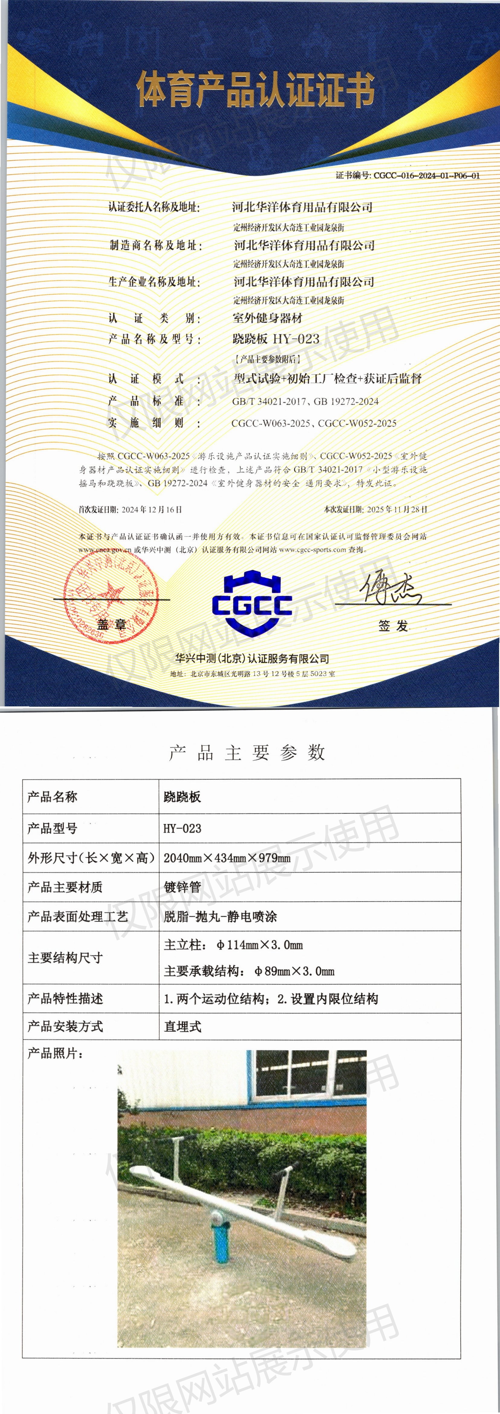 | 2 | 河北华洋体育用品有限公司 | CGCC-016-2024-01-P06-01 | 跷跷板 | HY-023 | 定州经济开发区大奇连工业园龙泉街 | GB/T 34021-2017、GB 19272-2024 | 2024-12-16 | 有效 | 查看 |