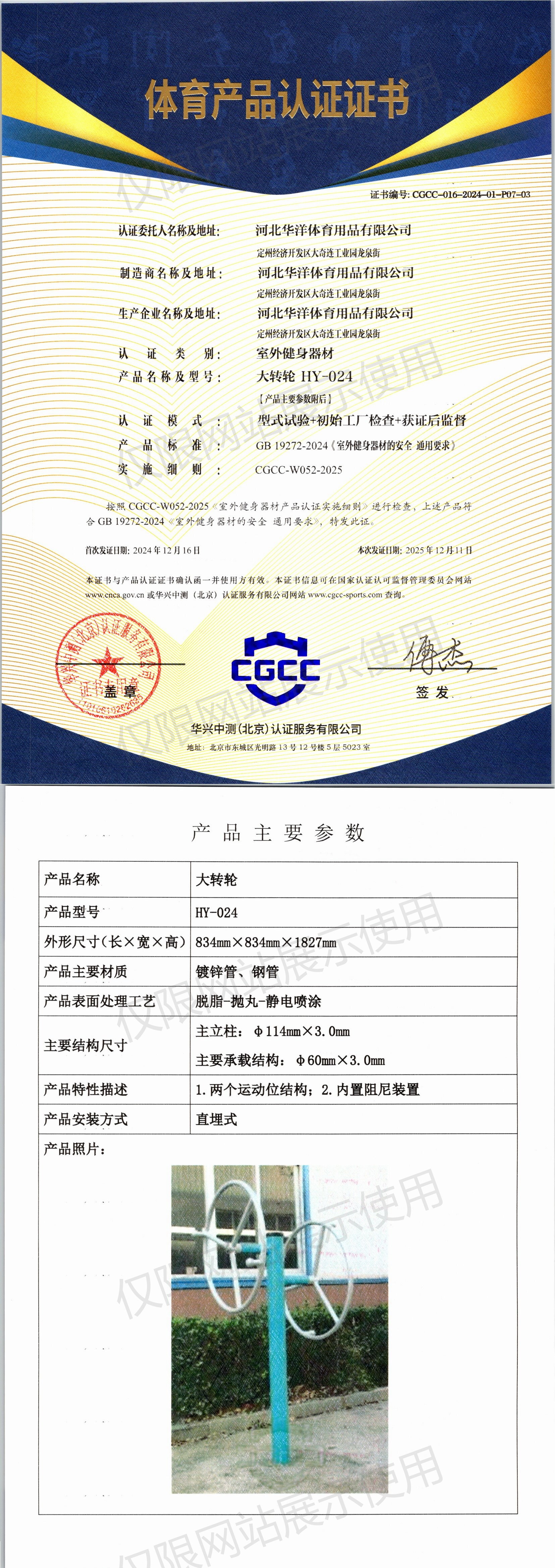 | 8 | 河北华洋体育用品有限公司 | CGCC-016-2024-01-P07-03 | 大转轮 | HY-024 | 定州经济开发区大奇连工业园龙泉街 | GB 19272-2024 | 2024-12-16 | 有效 | 查看 |