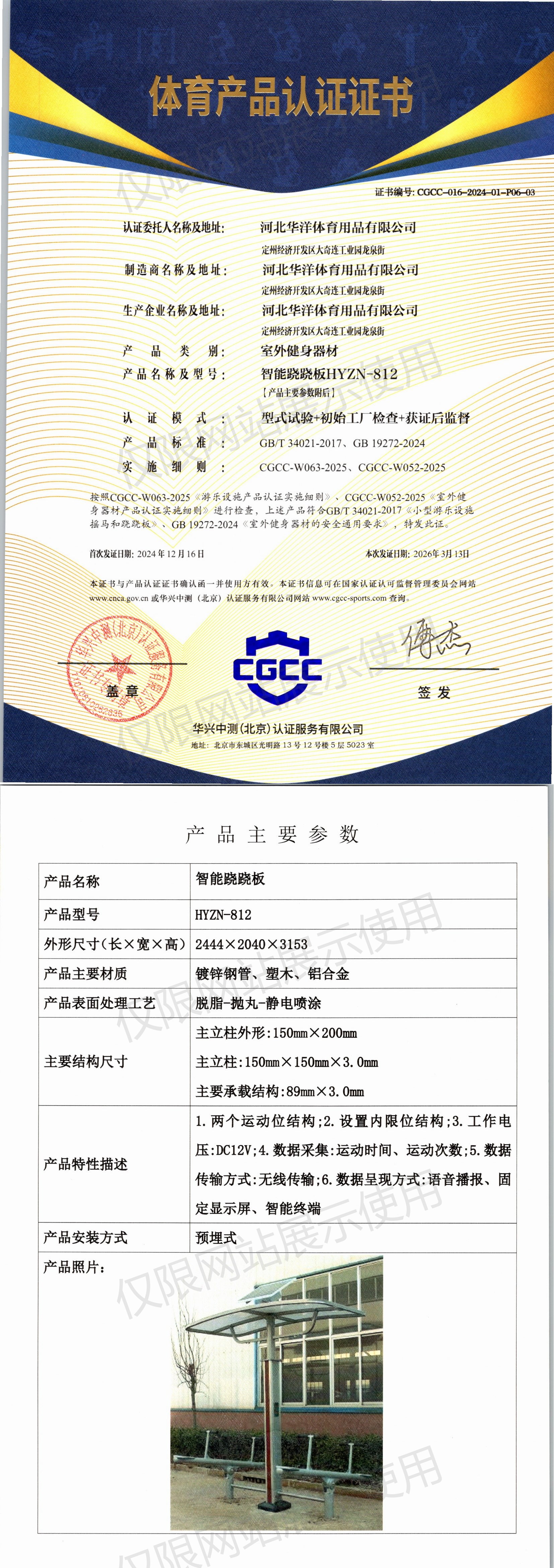 | 4 | 河北华洋体育用品有限公司 | CGCC-016-2024-01-P06-03 | 智能跷跷板 | HYZN-812 | 定州经济开发区大奇连工业园龙泉街 | GB/T 34021-2017、GB 19272-2024 | 2024-12-16 | 有效 | 查看 |