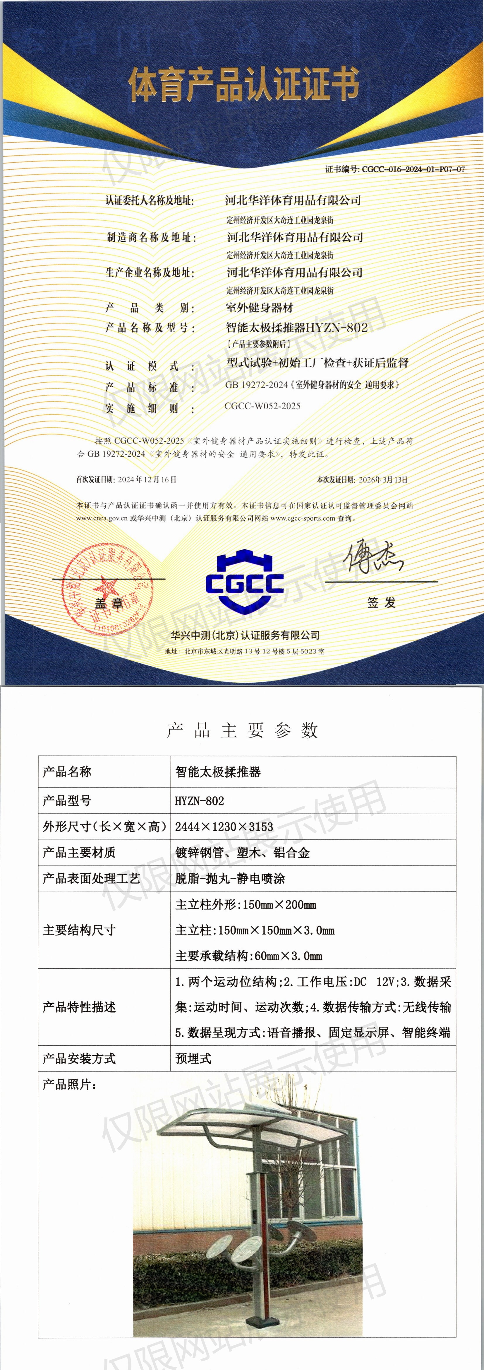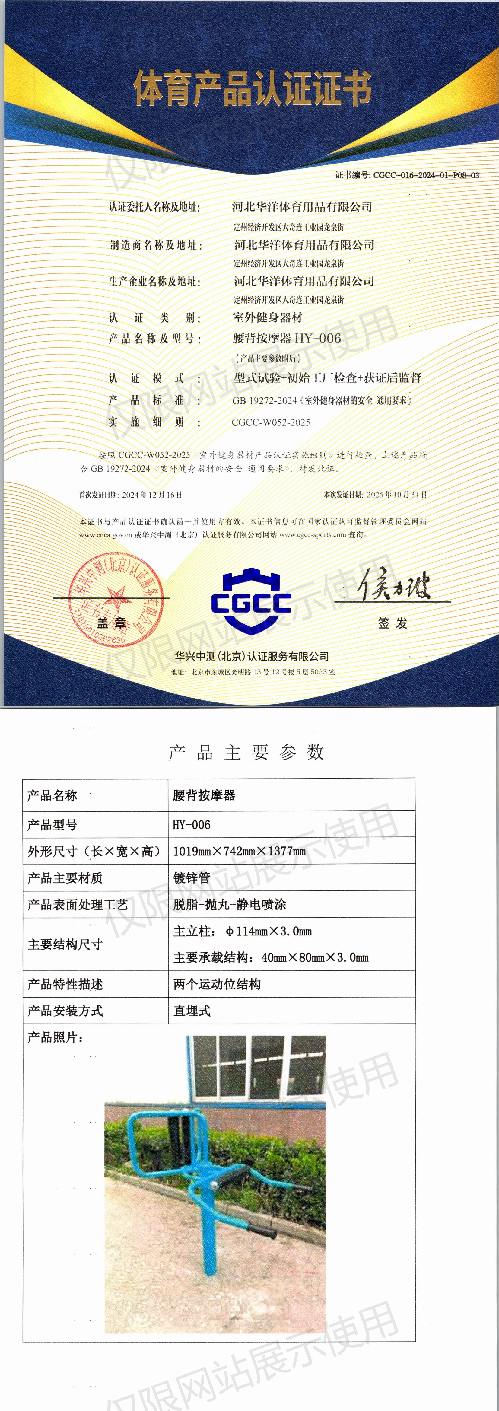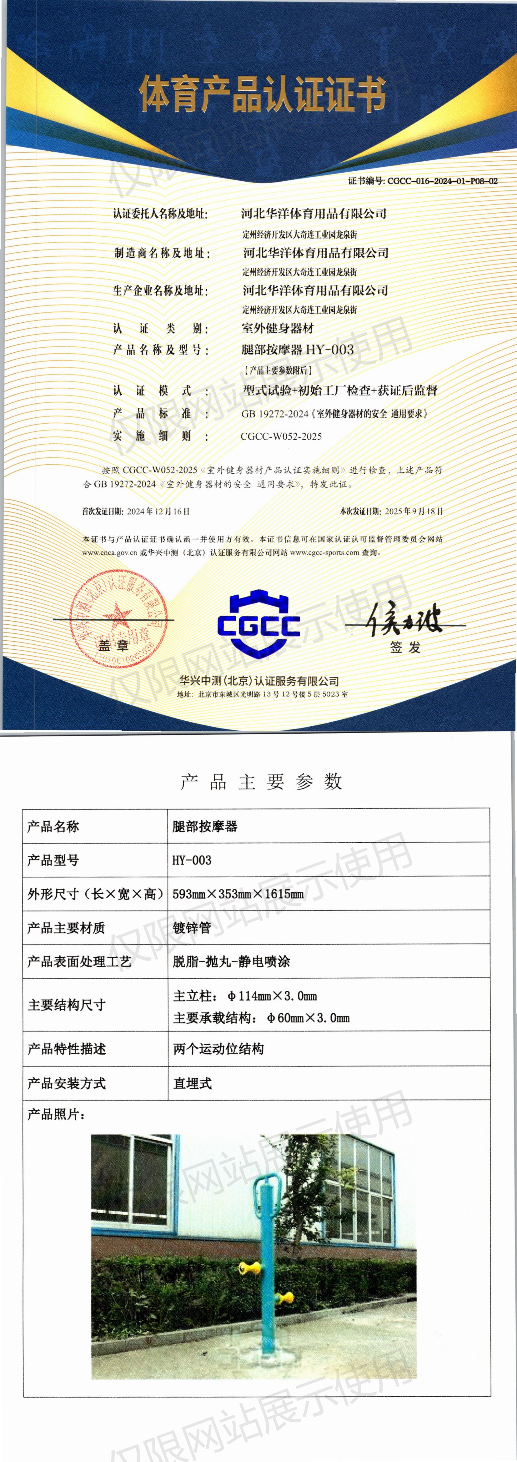 | 2 | 河北华洋体育用品有限公司 | CGCC-016-2024-01-P07-07 | 智能太极揉推器 | HYZN-802 | 定州经济开发区大奇连工业园龙泉街 | GB 19272-2024 | 2024-12-16 | 有效 | 查看 |