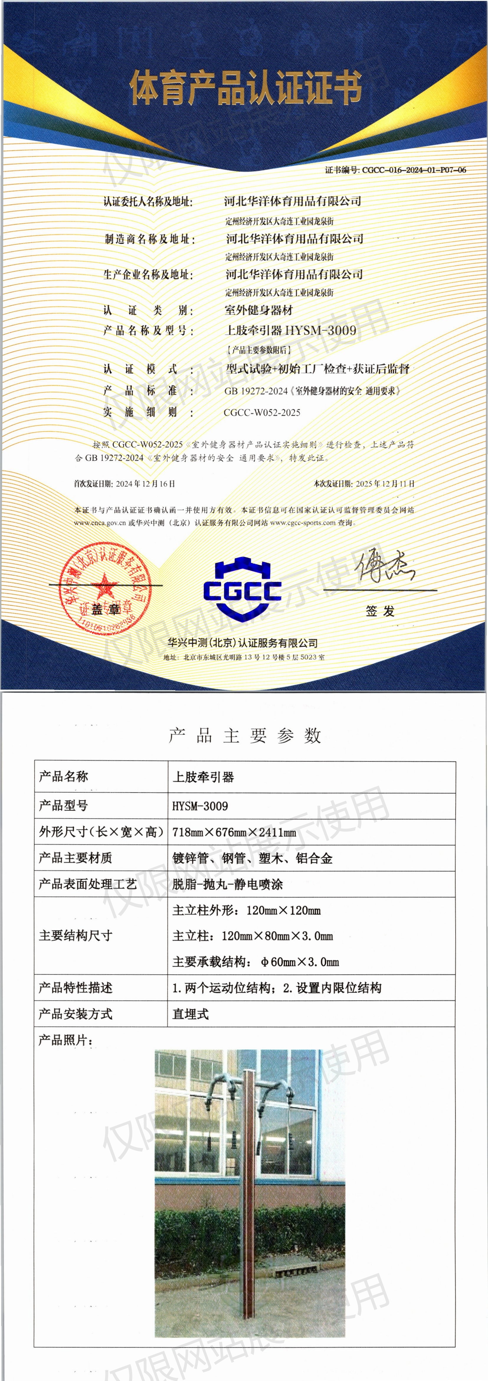 | 1 | 河北华洋体育用品有限公司 | CGCC-016-2024-01-P07-06 | 上肢牵引器 | HYSM-3009 | 定州经济开发区大奇连工业园龙泉街 | GB 19272-2024 | 2024-12-16 | 有效 | 查看 |
