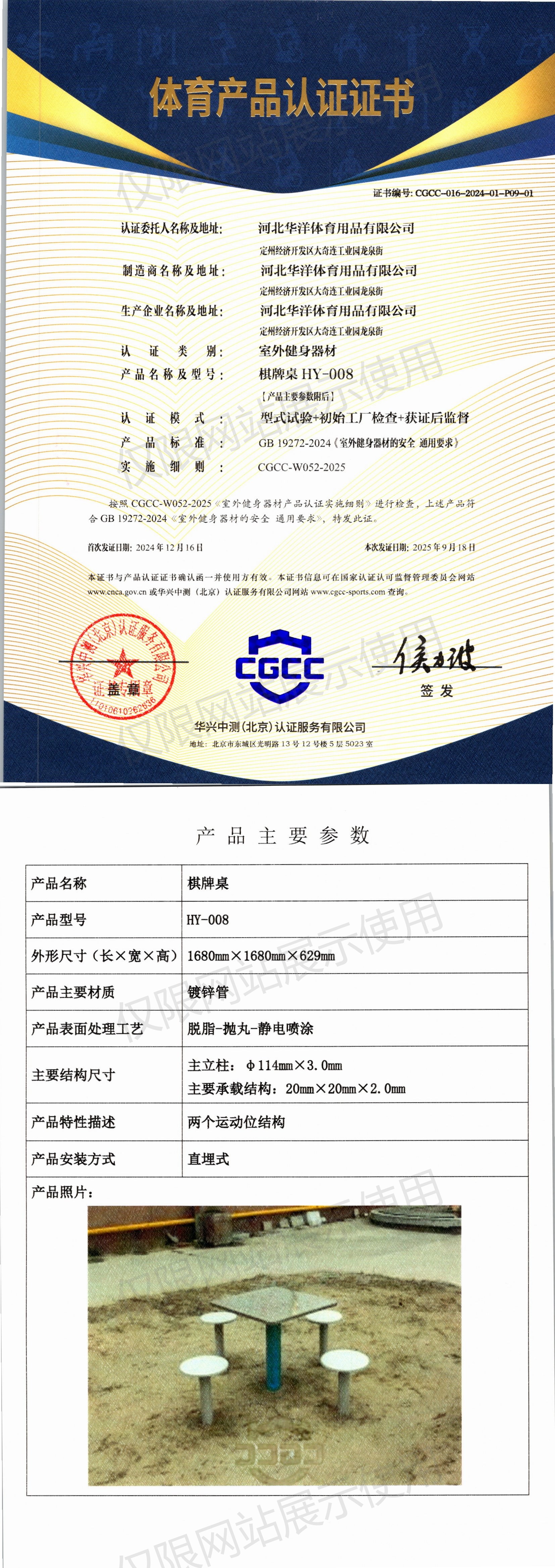 | 1 | 河北华洋体育用品有限公司 | CGCC-016-2024-01-P09-01 | 棋牌桌 | HY-008 | 定州经济开发区大奇连工业园龙泉街 | GB 19272-2024 | 2024-12-16 | 有效 | 查看 |