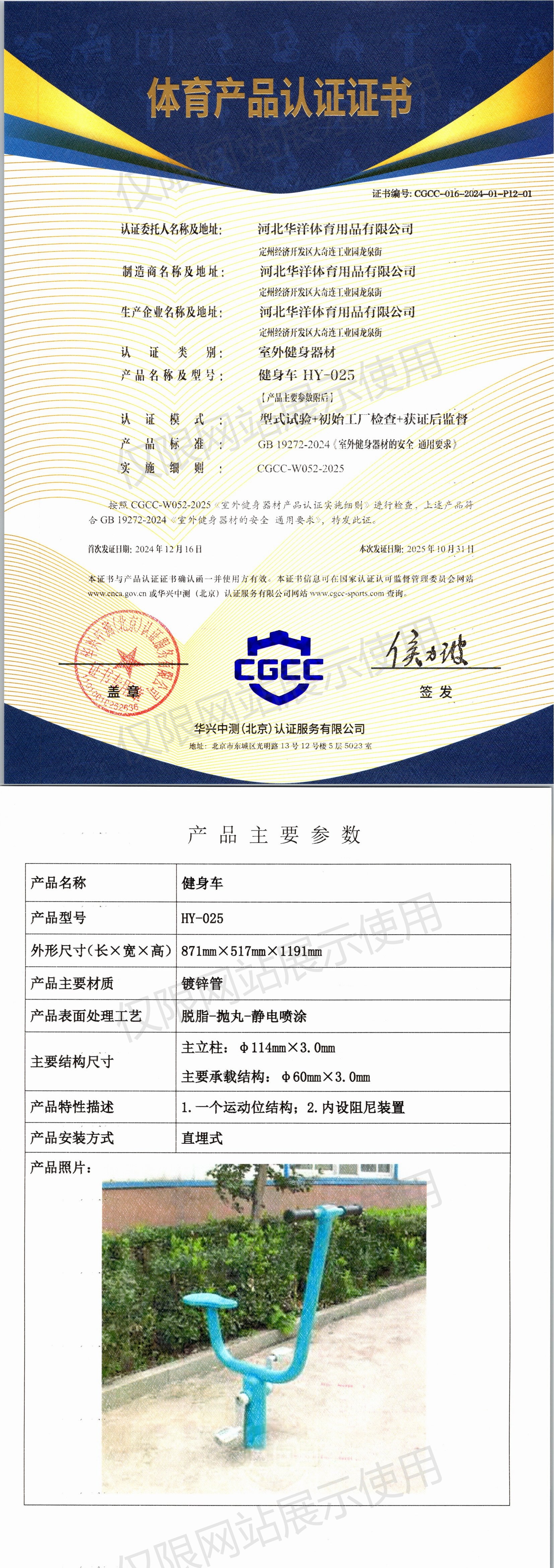 | 8 | 河北华洋体育用品有限公司 | CGCC-016-2024-01-P12-01 | 健身车 | HY-025 | 定州经济开发区大奇连工业园龙泉街 | GB 19272-2024 | 2024-12-16 | 有效 | 查看 |