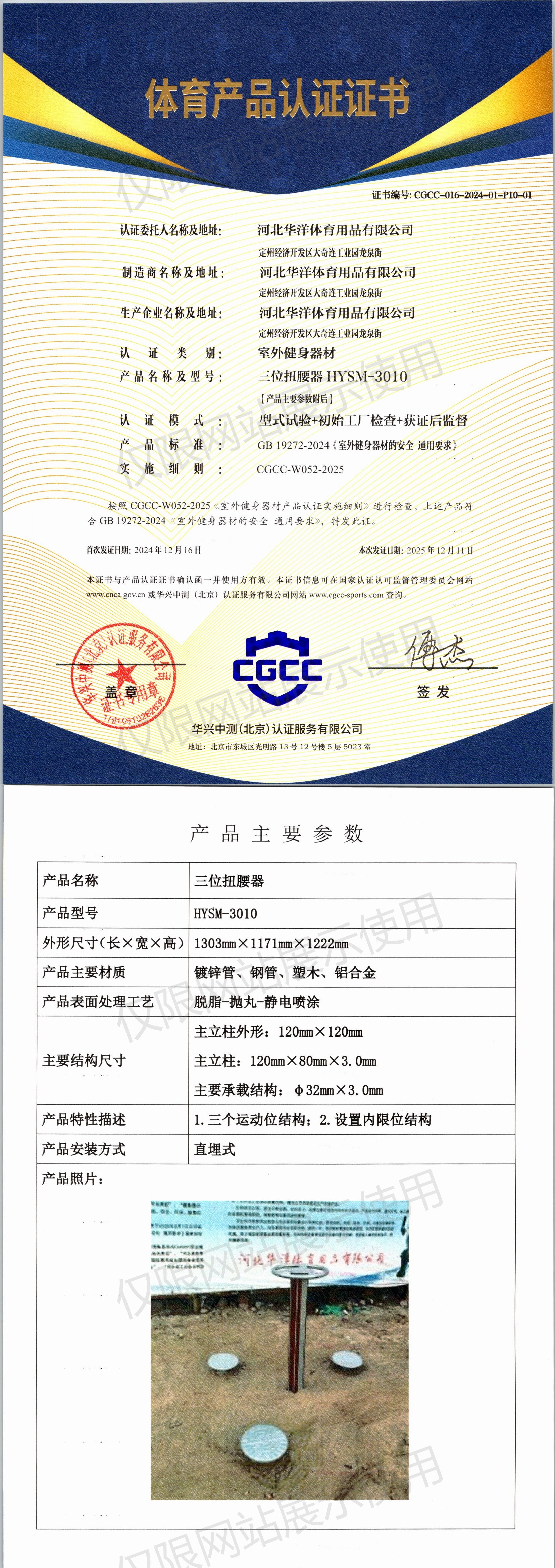 | 4 | 河北华洋体育用品有限公司 | CGCC-016-2024-01-P10-01 | 三位扭腰器 | HYSM-3010 | 定州经济开发区大奇连工业园龙泉街 | GB 19272-2024 | 2024-12-16 | 有效 | 查看 |