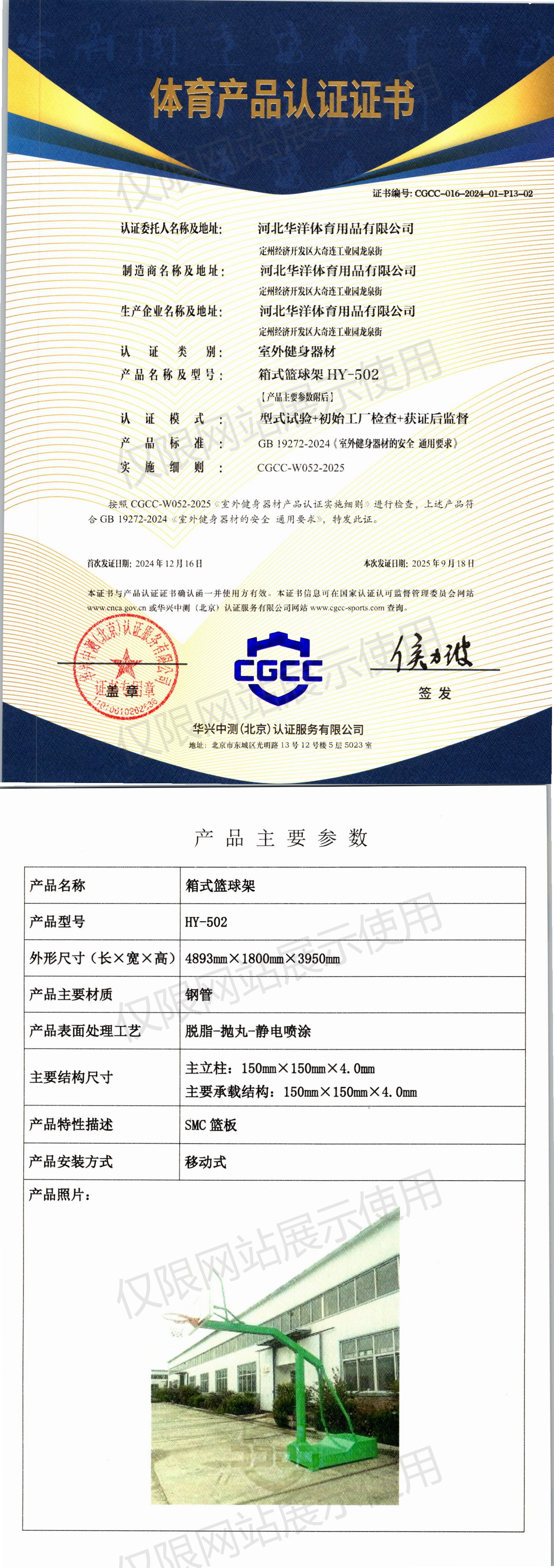| 5 | 河北华洋体育用品有限公司 | CGCC-016-2024-01-P13-02 | 箱式篮球架 | HY-502 | 定州经济开发区大奇连工业园龙泉街 | GB 19272-2024 | 2024-12-16 | 有效 | 查看 |