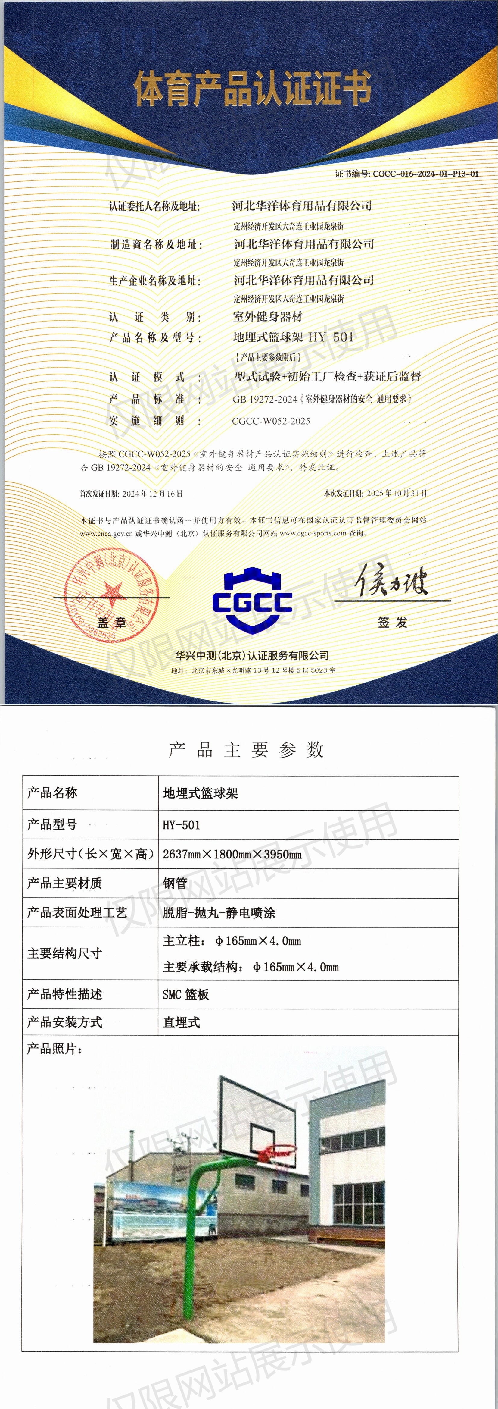 | 4 | 河北华洋体育用品有限公司 | CGCC-016-2024-01-P13-01 | 地埋式篮球架 | HY-501 | 定州经济开发区大奇连工业园龙泉街 | GB 19272-2024 | 2024-12-16 | 有效 | 查看 |