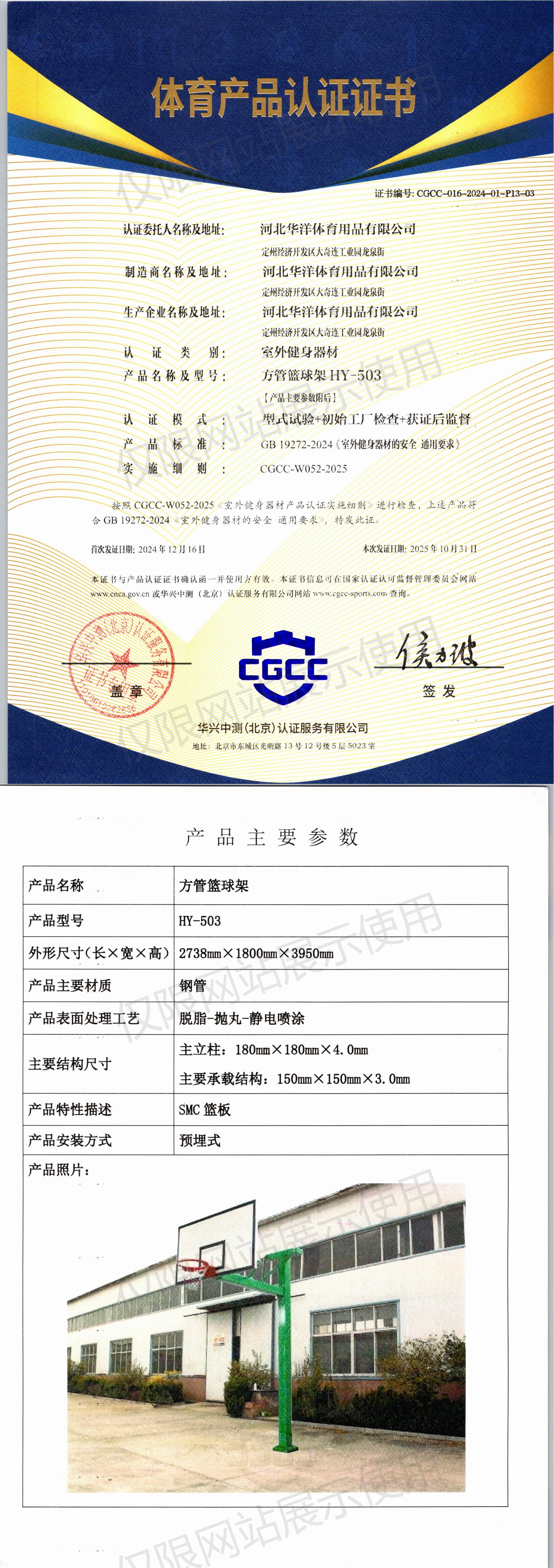 | 6 | 河北华洋体育用品有限公司 | CGCC-016-2024-01-P13-03 | 方管篮球架 | HY-503 | 定州经济开发区大奇连工业园龙泉街 | GB 19272-2024 | 2024-12-16 | 有效 | 查看 |
