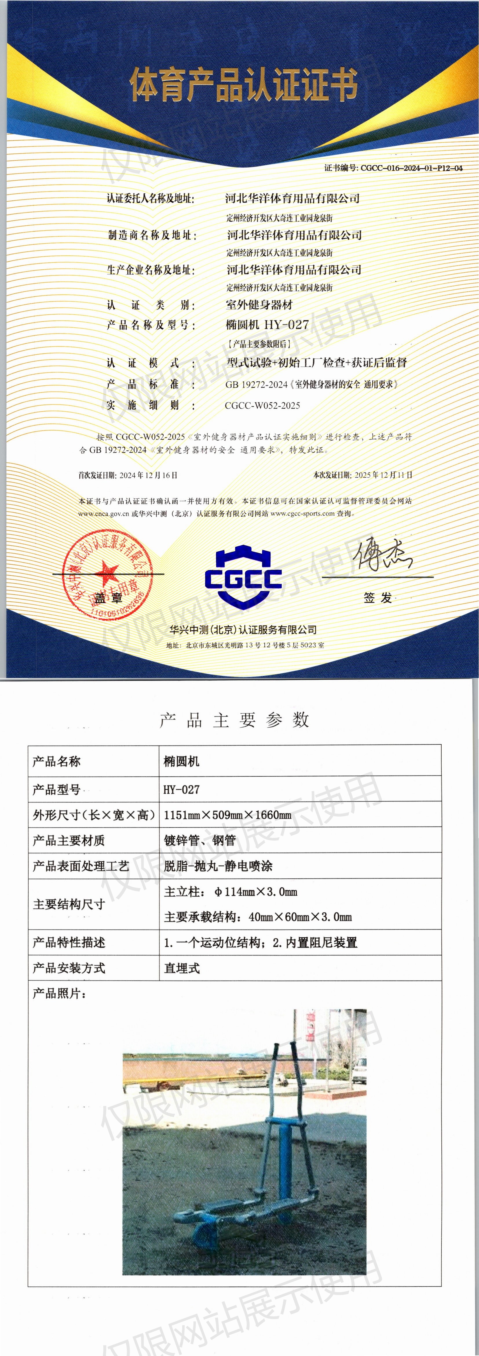 | 1 | 河北华洋体育用品有限公司 | CGCC-016-2024-01-P12-04 | 椭圆机 | HY-027 | 定州经济开发区大奇连工业园龙泉街 | GB 19272-2024 | 2024-12-16 | 有效 | 查看 |