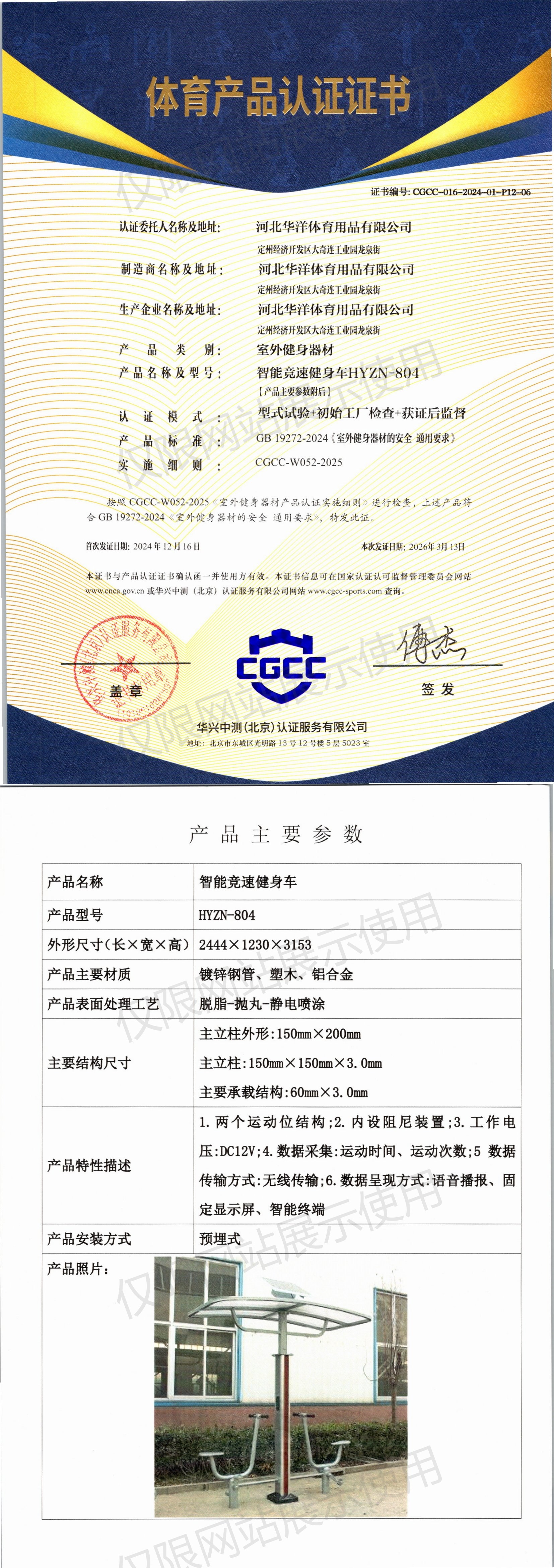 | 3 | 河北华洋体育用品有限公司 | CGCC-016-2024-01-P12-06 | 智能竞速健身车 | HYZN-804 | 定州经济开发区大奇连工业园龙泉街 | GB 19272-2024 | 2024-12-16 | 有效 | 查看 |