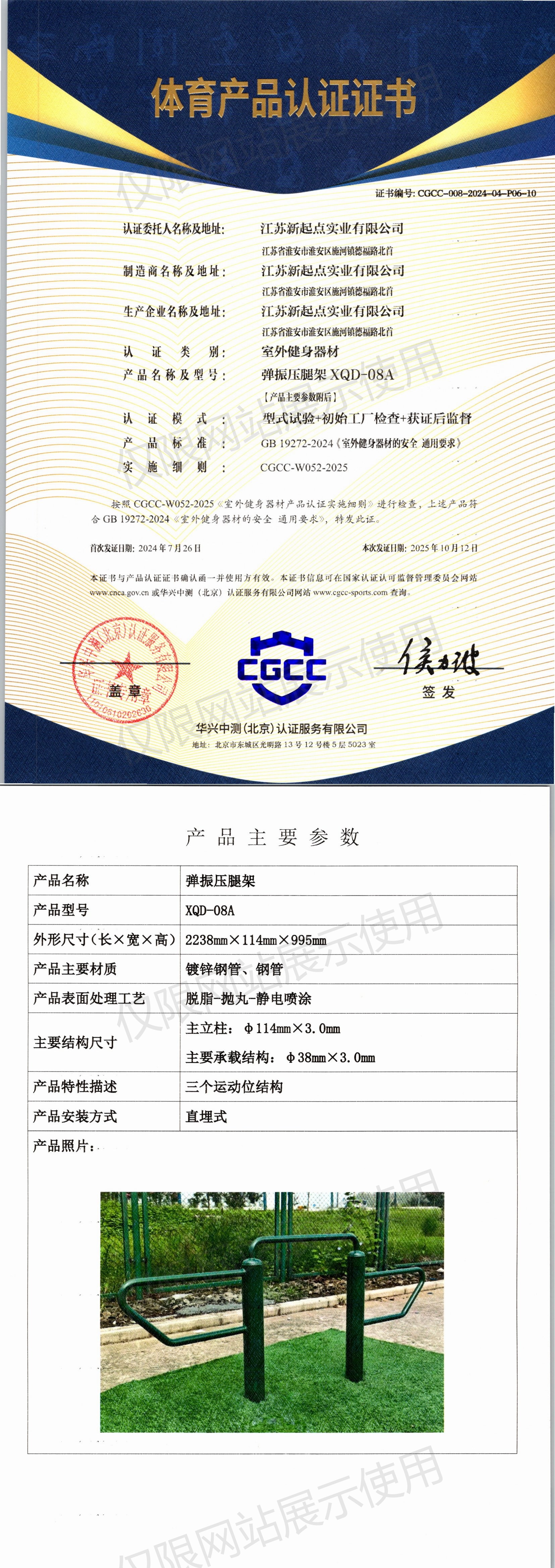 | 5 | 江苏新起点实业有限公司 | CGCC-008-2024-04-P06-10 | 弹振压腿架 | XQD-08A | 江苏省淮安市淮安区施河镇德福路北首 | GB 19272-2024 | 2025-01-06 | 有效 | 查看 |