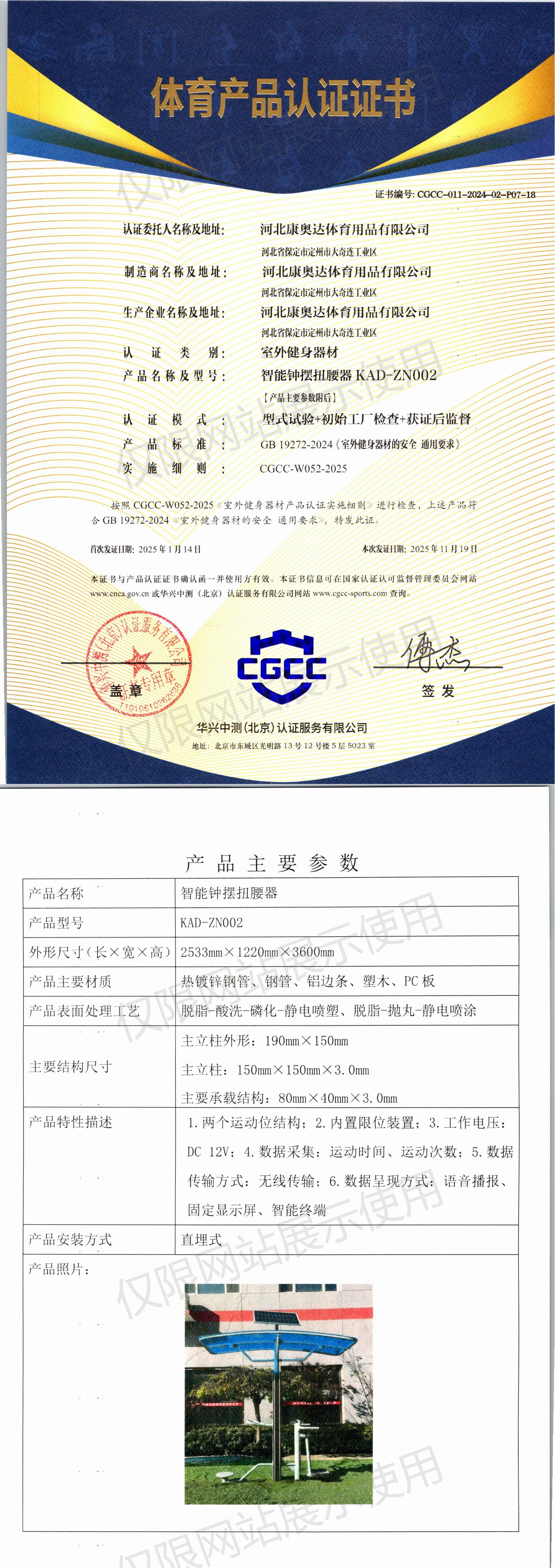 | 4 | 河北康奥达体育用品有限公司 | CGCC-011-2024-02-P07-18 | 智能钟摆扭腰器 | KAD-ZN002 | 河北省保定市定州市大奇连工业区 | GB 19272-2024 | 2025-01-14 | 有效 | 查看 |
