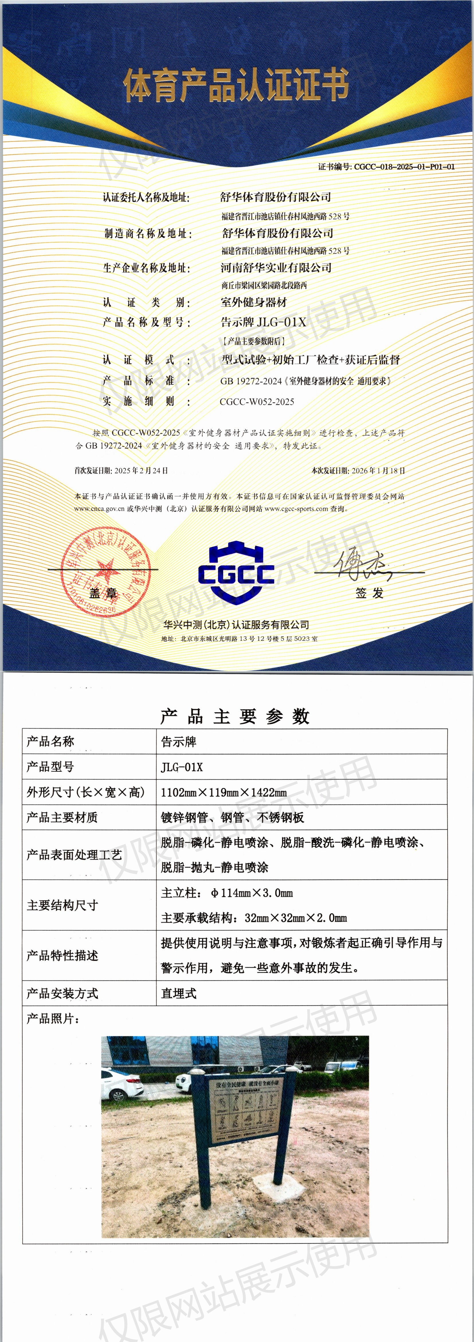 | 7 | 舒华体育股份有限公司 | CGCC-018-2025-01-P01-01 | 告示牌 | JLG-01X | 商丘市梁园区梁园路北段路西 | GB 19272-2024 | 2025-02-24 | 有效 | 查看 |