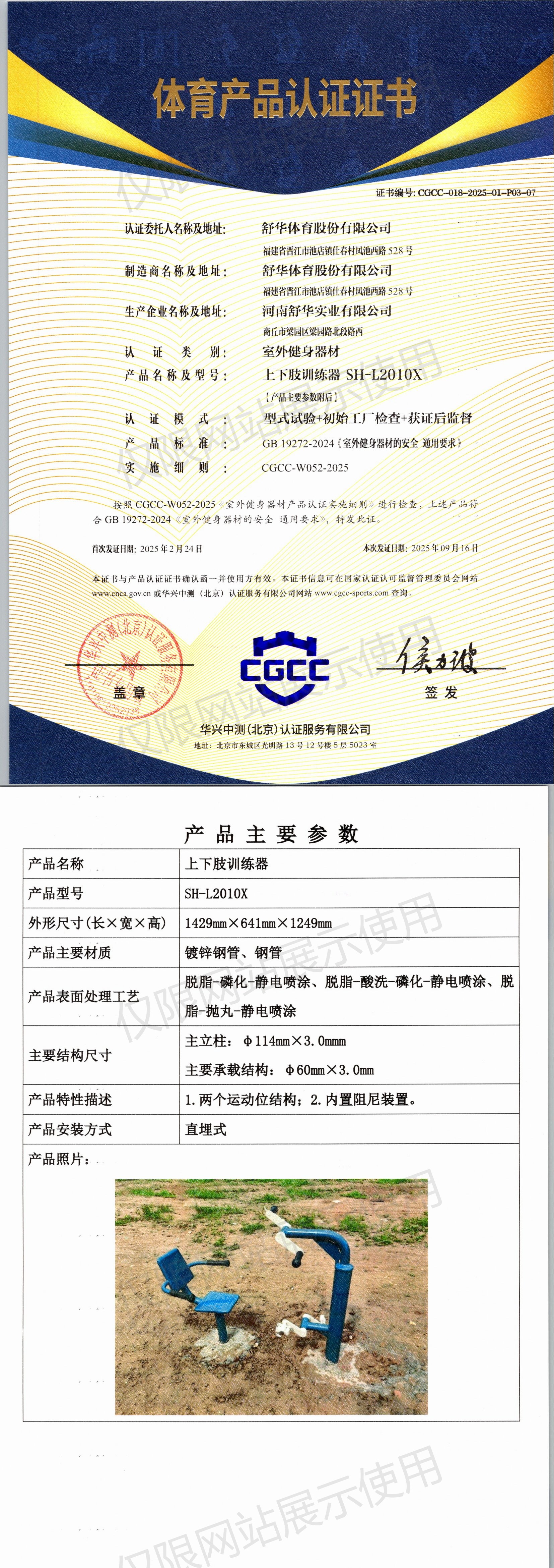 | 6 | 舒华体育股份有限公司 | CGCC-018-2025-01-P03-07 | 上下肢训练器 | SH-L2010X | 商丘市梁园区梁园路北段路西 | GB 19272-2024 | 2025-02-24 | 有效 | 查看 |