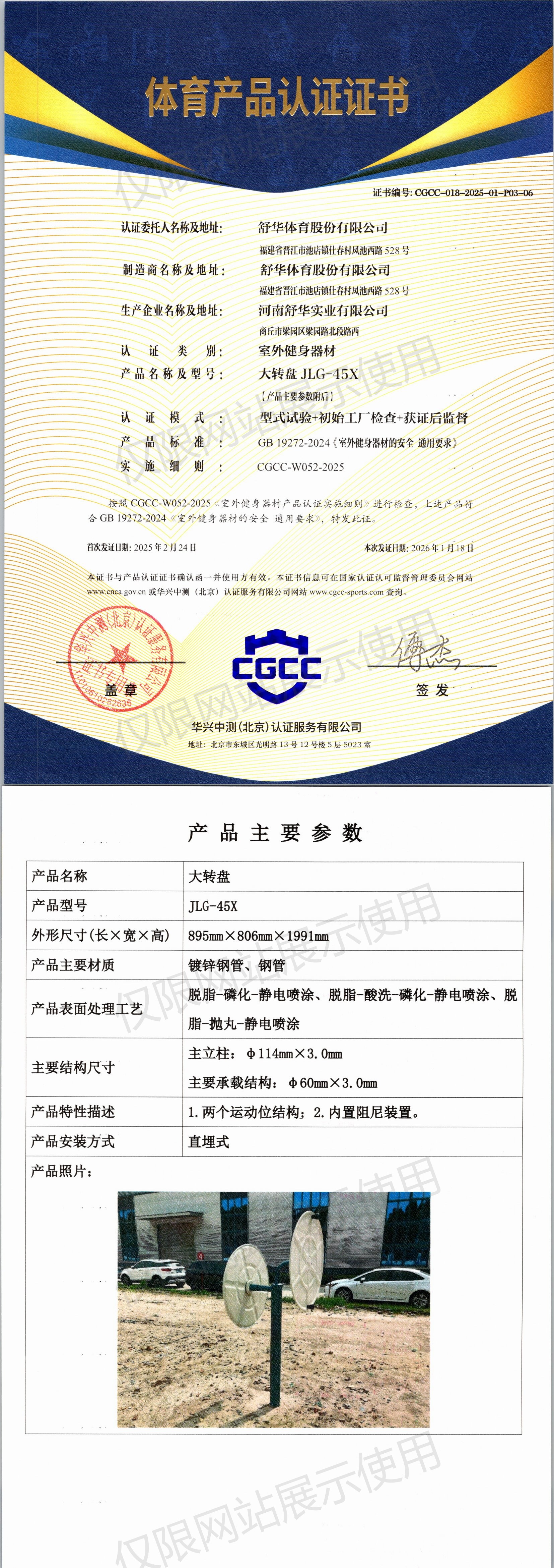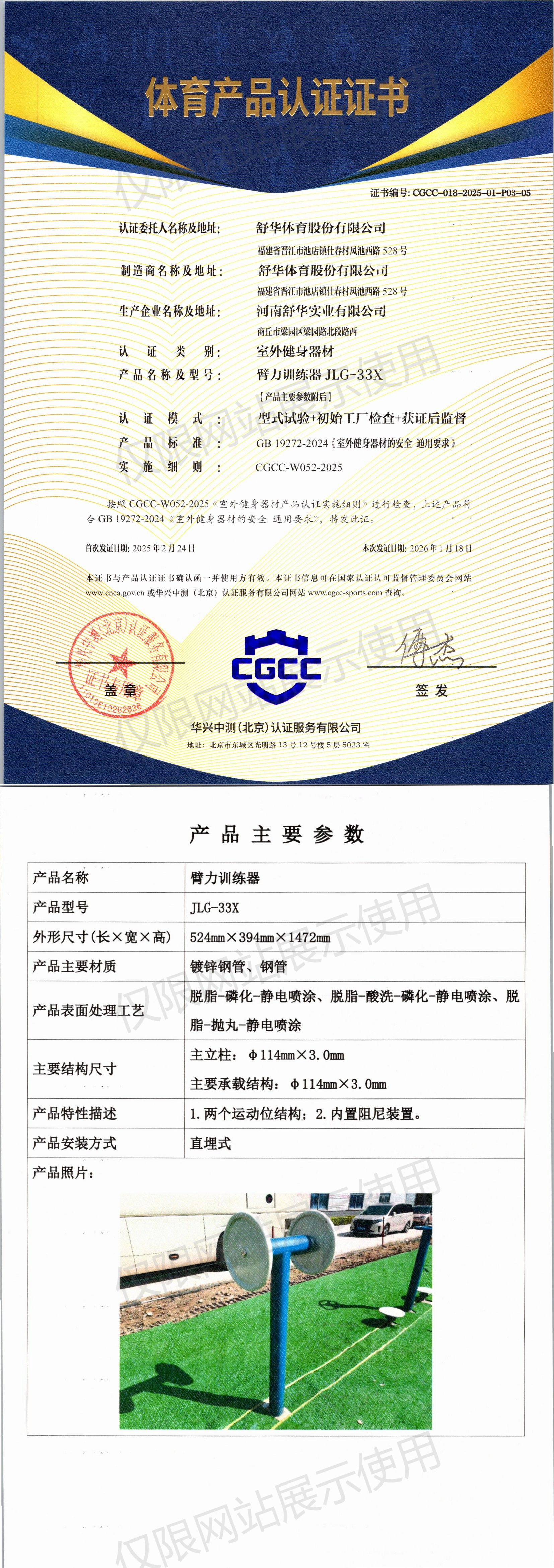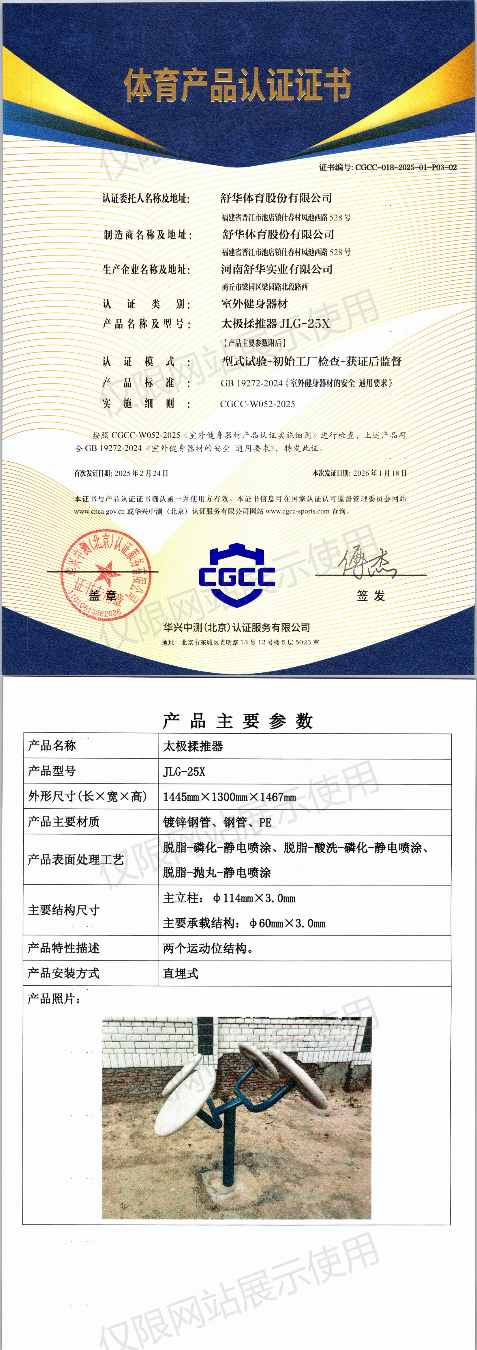 | 2 | 舒华体育股份有限公司 | CGCC-018-2025-01-P03-03 | 二位太极揉推轮 | JLG-26AX | 商丘市梁园区梁园路北段路西 | GB 19272-2024 | 2025-02-24 | 有效 | 查看 |
