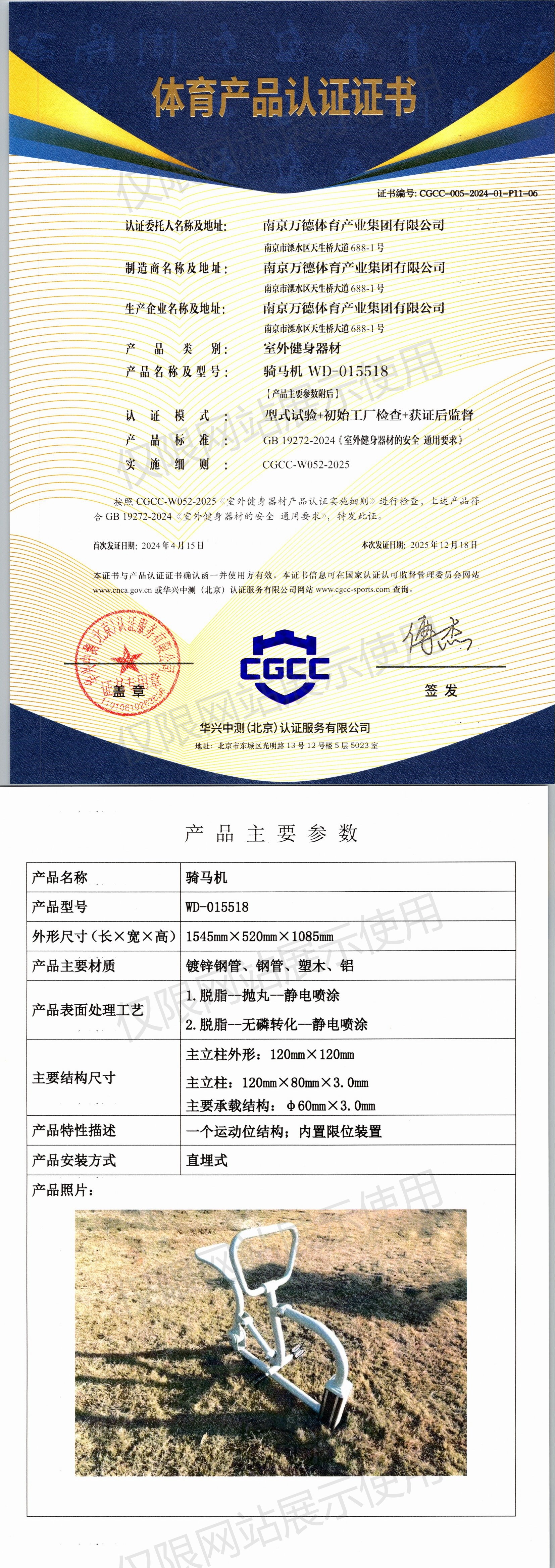 | 9 | 南京万德体育产业集团有限公司 | CGCC-005-2024-01-P11-05 | 健骑机 | WD-015114 | 南京市溧水区天生桥大道688-1号 | GB 19272-2024 | 2024-04-15 | 有效 | 查看 |