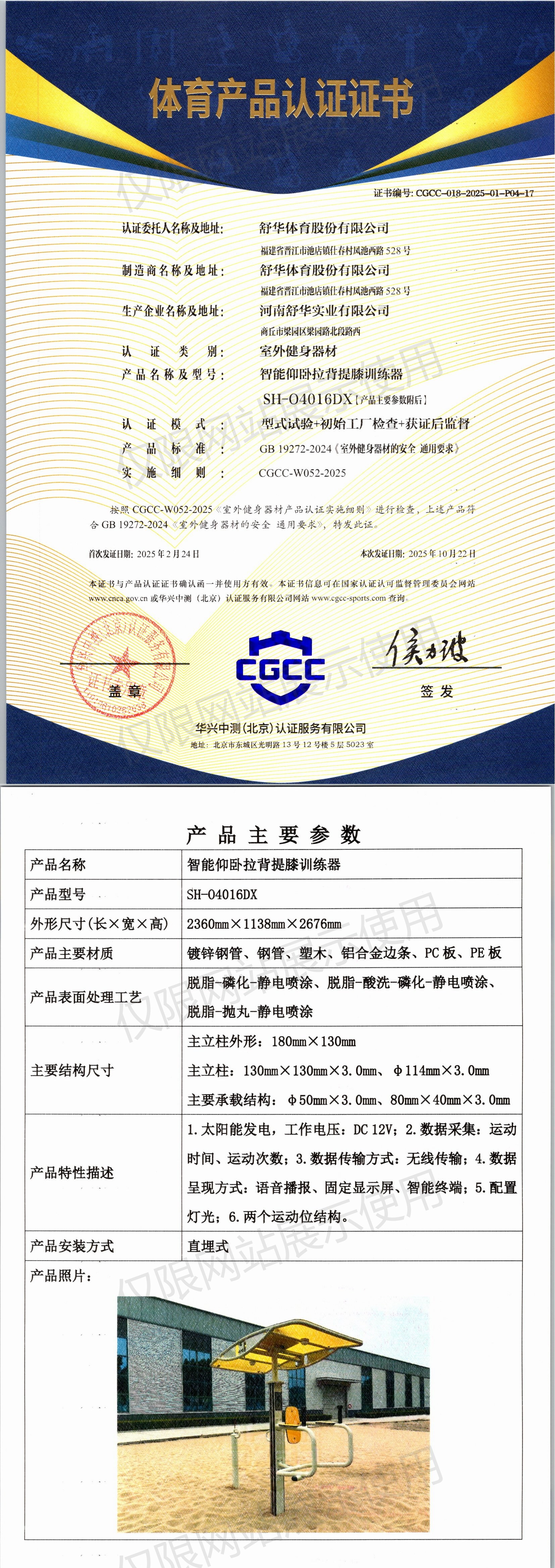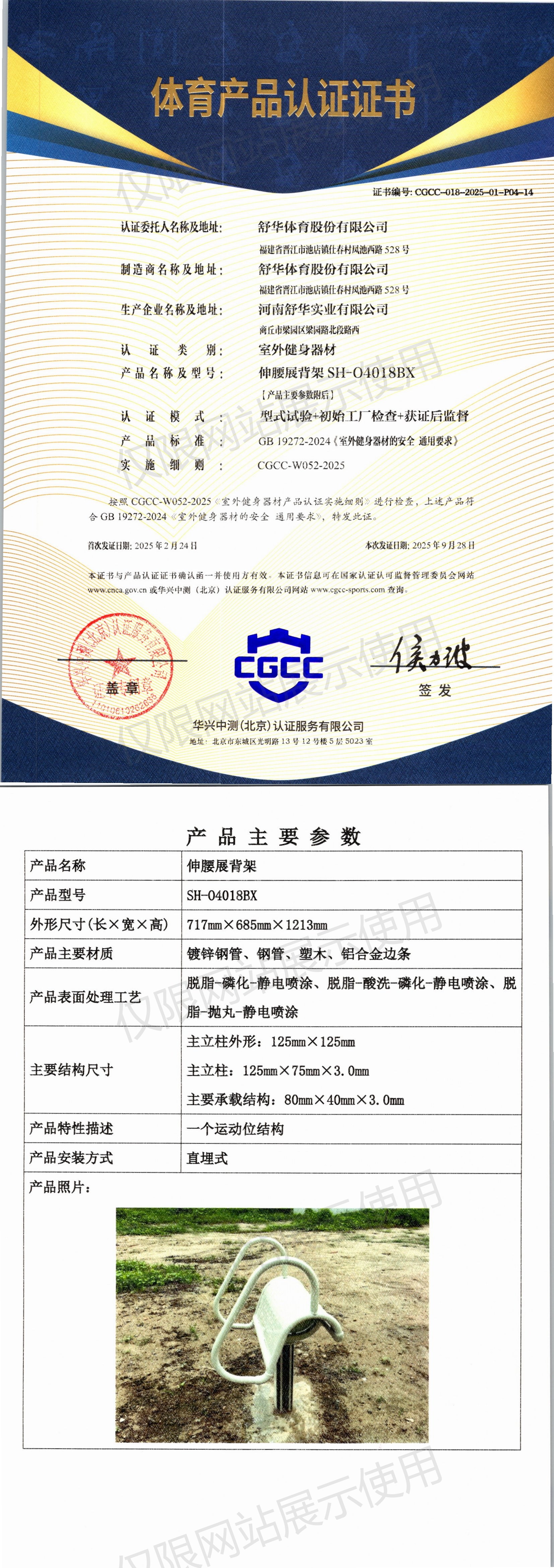 | 4 | 舒华体育股份有限公司 | CGCC-018-2025-01-P04-14 | 伸腰展背架 | SH-O4018BX | 商丘市梁园区梁园路北段路西 | GB 19272-2024 | 2025-02-24 | 有效 | 查看 |