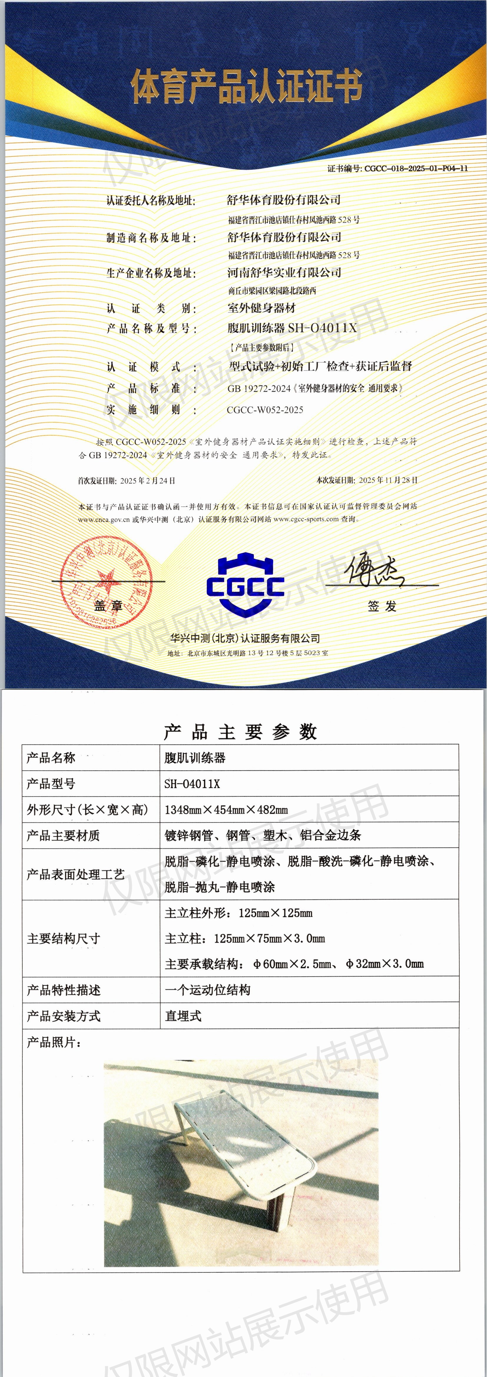 | 1 | 舒华体育股份有限公司 | CGCC-018-2025-01-P04-11 | 腹肌训练器 | SH-O4011X | 商丘市梁园区梁园路北段路西 | GB 19272-2024 | 2025-02-24 | 有效 | 查看 |