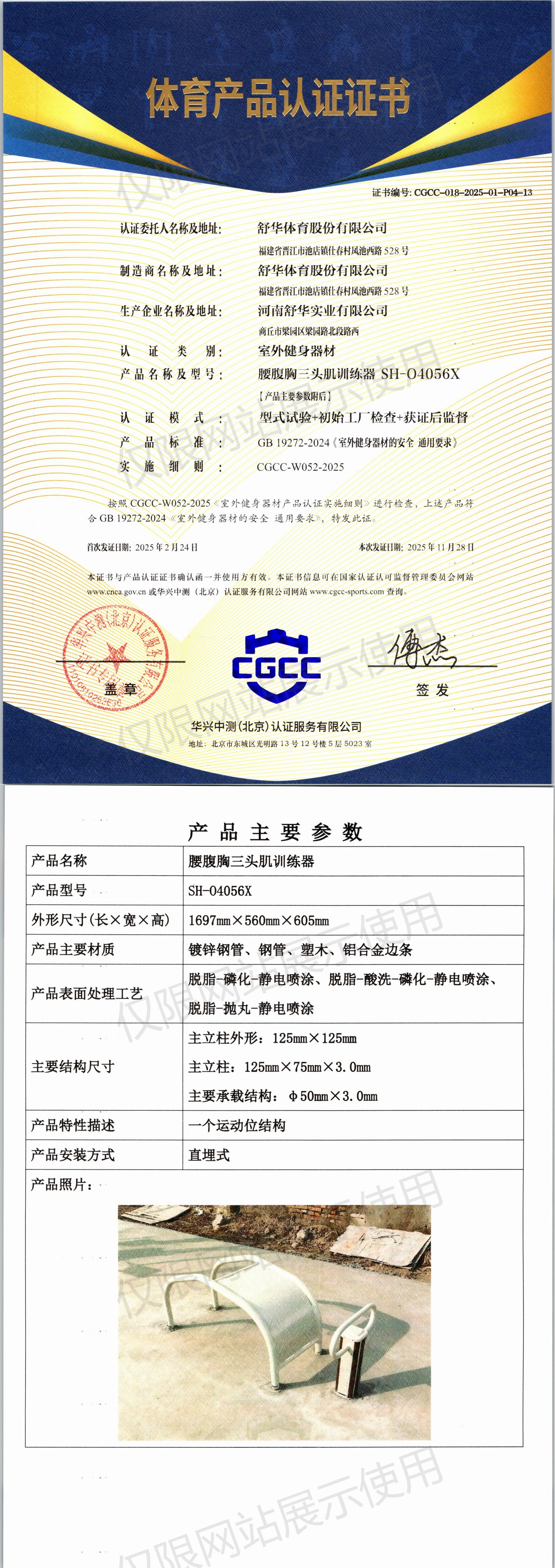 | 2 | 舒华体育股份有限公司 | CGCC-018-2025-01-P04-12 | 双位腹肌训练器 | SH-O4011AX | 商丘市梁园区梁园路北段路西 | GB 19272-2024 | 2025-02-24 | 有效 | 查看 |
