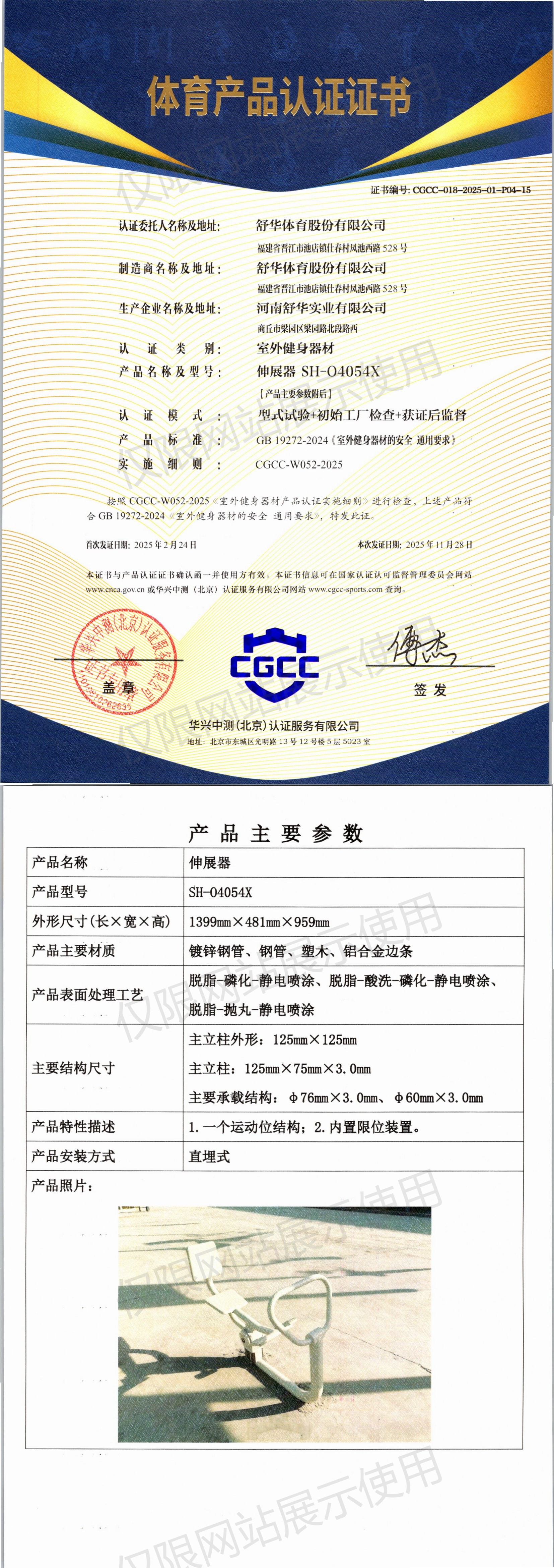 | 5 | 舒华体育股份有限公司 | CGCC-018-2025-01-P04-15 | 伸展器 | SH-O4054X | 商丘市梁园区梁园路北段路西 | GB 19272-2024 | 2025-02-24 | 有效 | 查看 |
