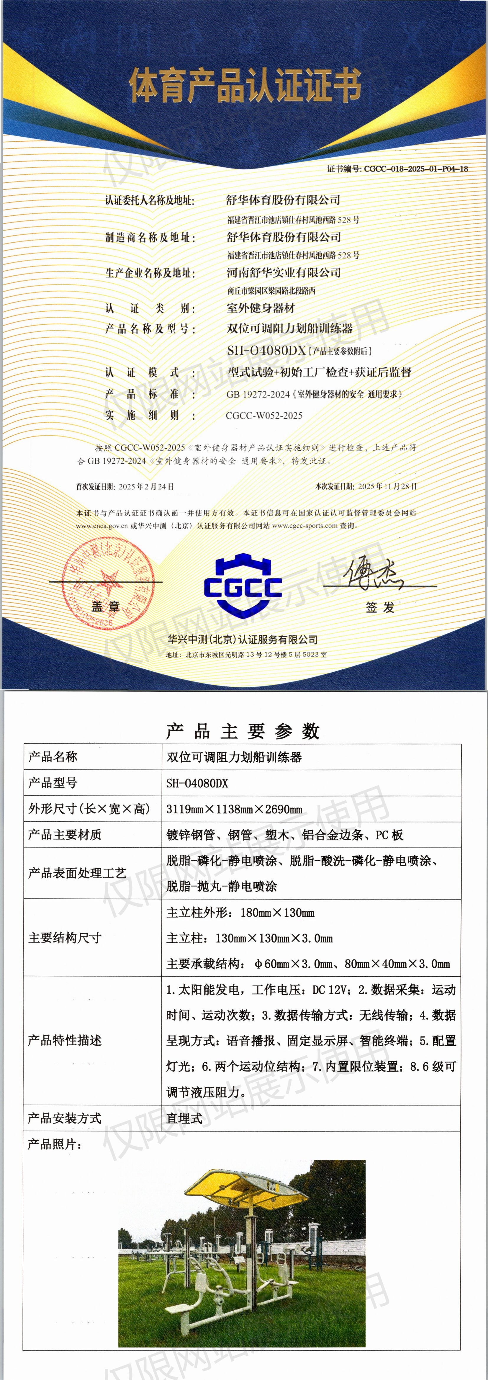 | 8 | 舒华体育股份有限公司 | CGCC-018-2025-01-P04-18 | 双位可调阻力划船训练器 | SH-O4080DX | 商丘市梁园区梁园路北段路西 | GB 19272-2024 | 2025-02-24 | 有效 | 查看 |