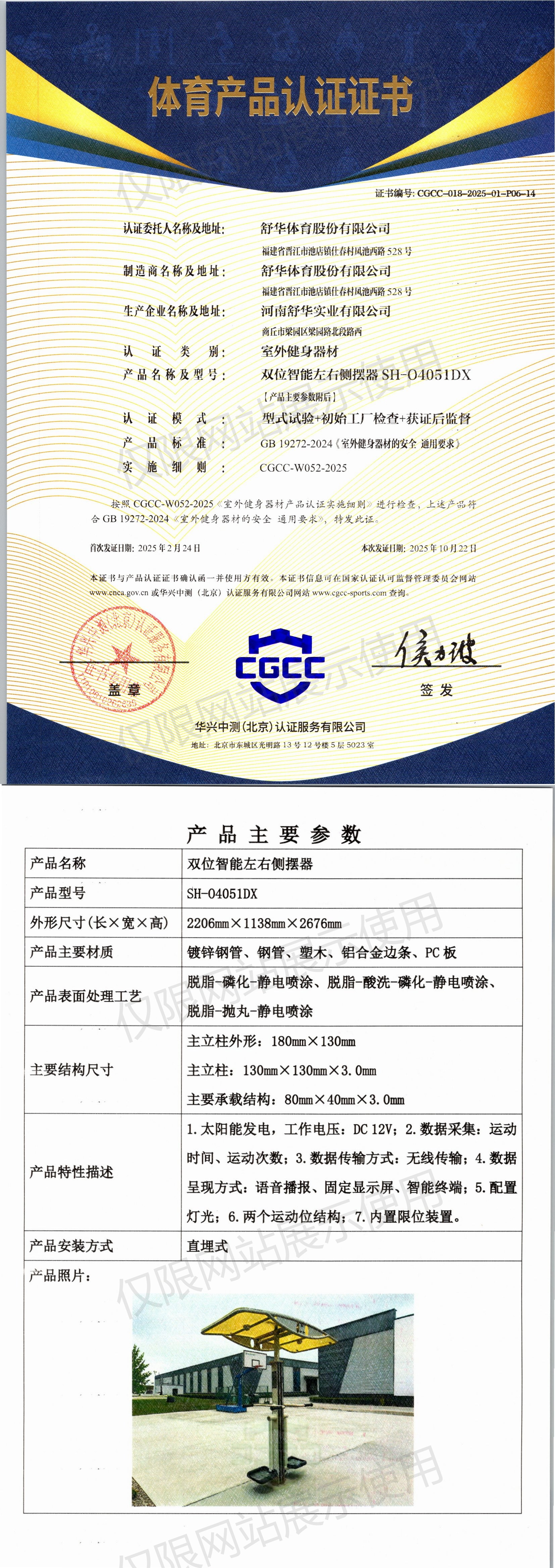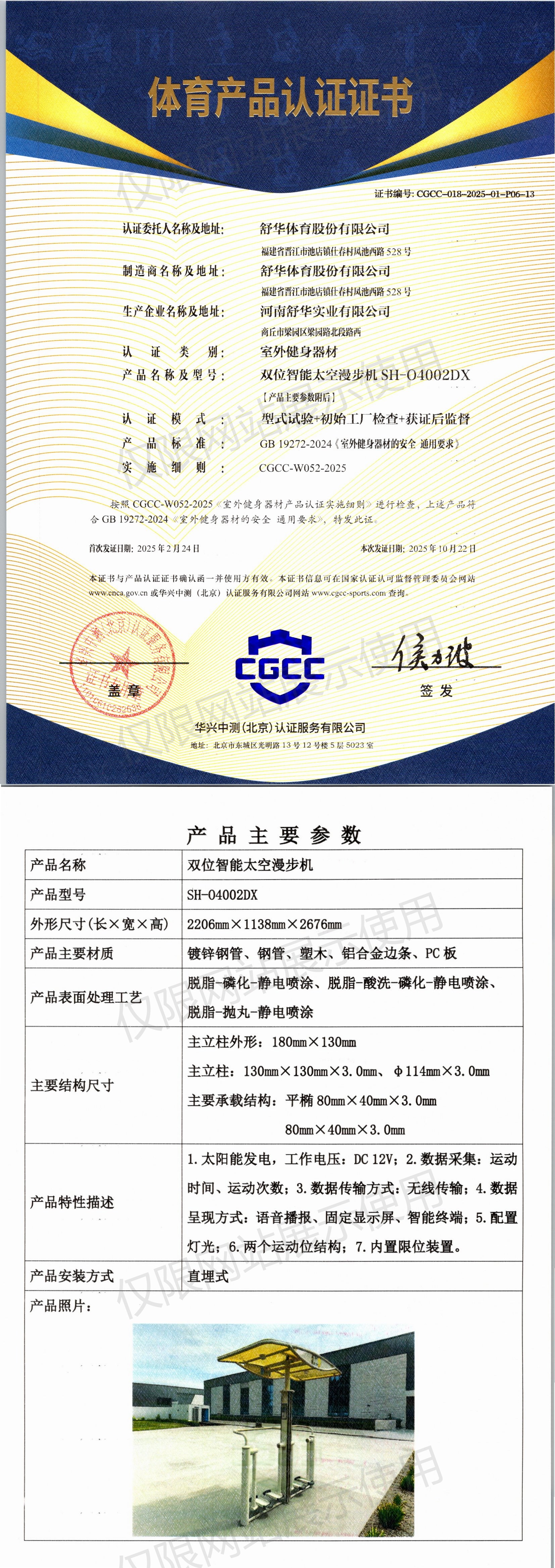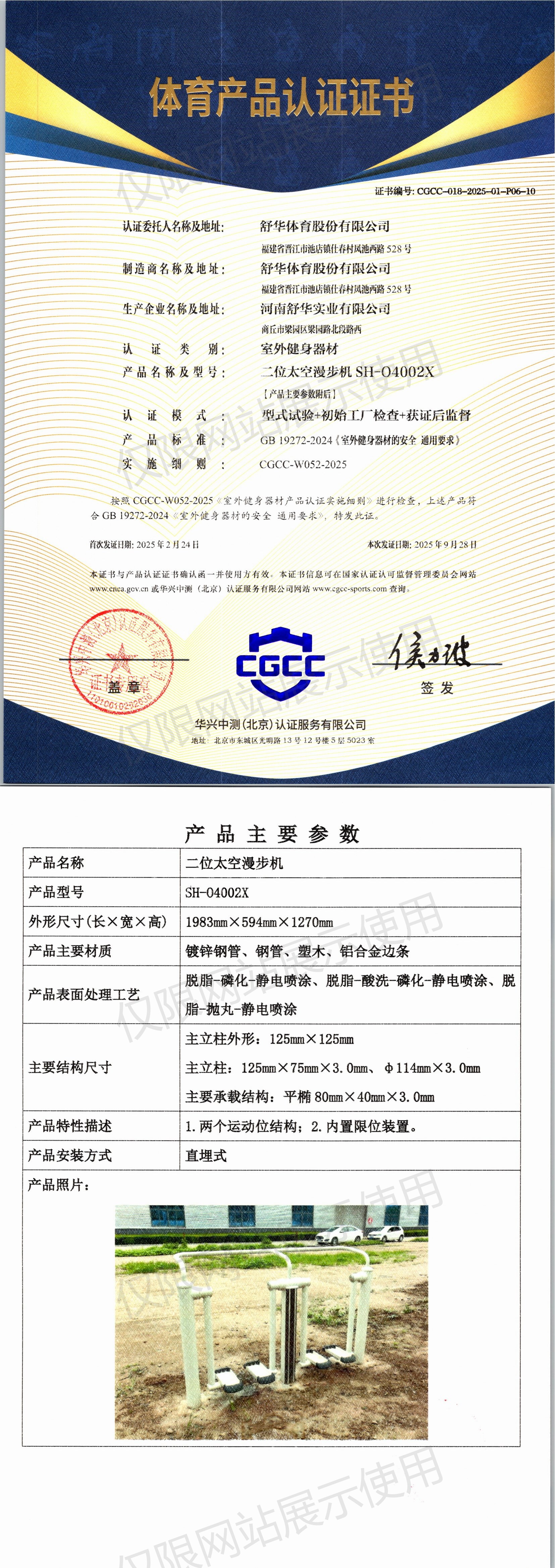 | 4 | 舒华体育股份有限公司 | CGCC-018-2025-01-P06-10 | 二位太空漫步机 | SH-O4002X | 商丘市梁园区梁园路北段路西 | GB 19272-2024 | 2025-02-24 | 有效 | 查看 |