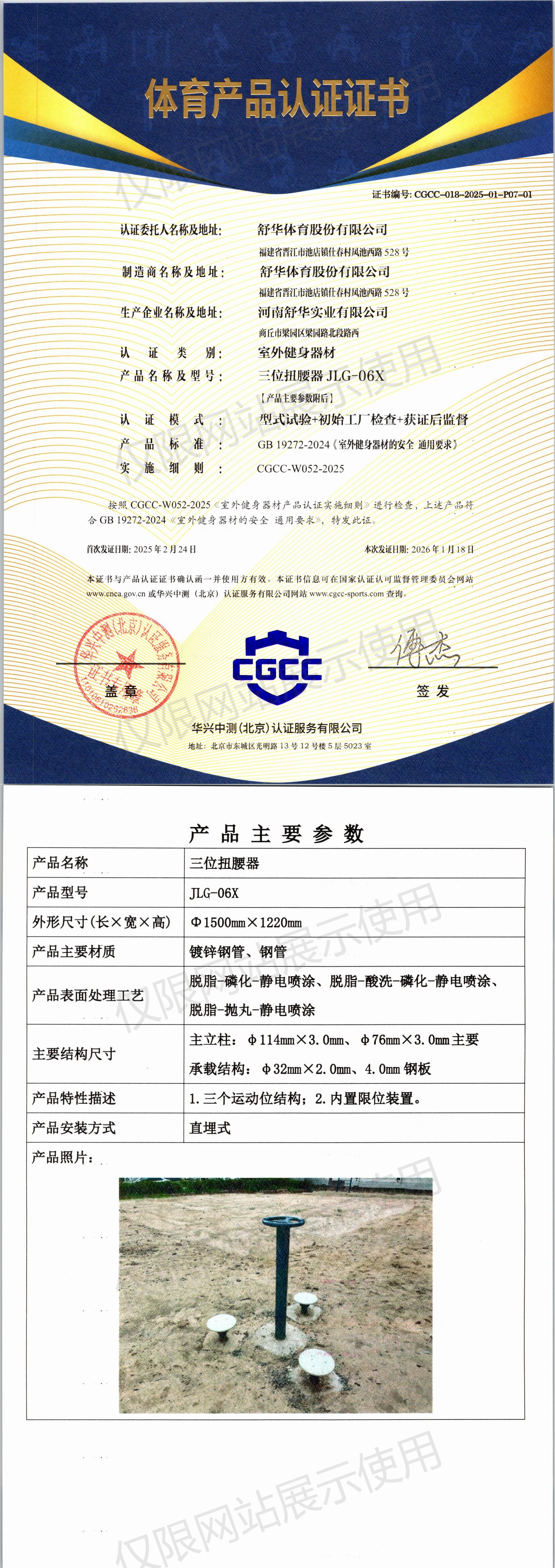 | 9 | 舒华体育股份有限公司 | CGCC-018-2025-01-P07-01 | 三位扭腰器 | JLG-06X | 商丘市梁园区梁园路北段路西 | GB 19272-2024 | 2025-02-24 | 有效 | 查看 |