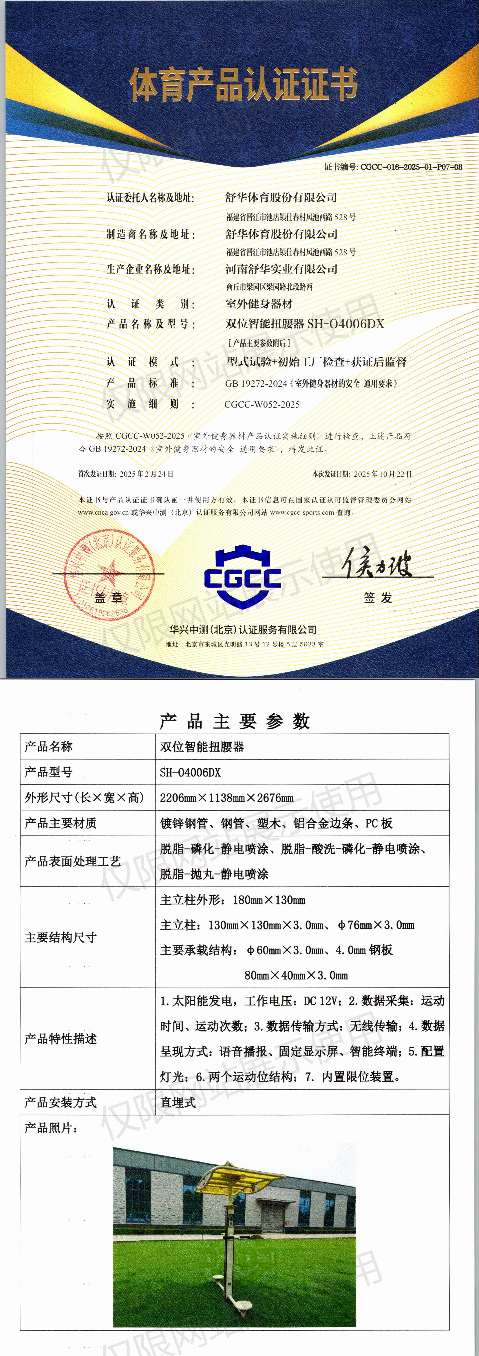 | 6 | 舒华体育股份有限公司 | CGCC-018-2025-01-P07-08 | 双位智能扭腰器 | SH-O4006DX | 商丘市梁园区梁园路北段路西 | GB 19272-2024 | 2025-02-24 | 有效 | 查看 |
