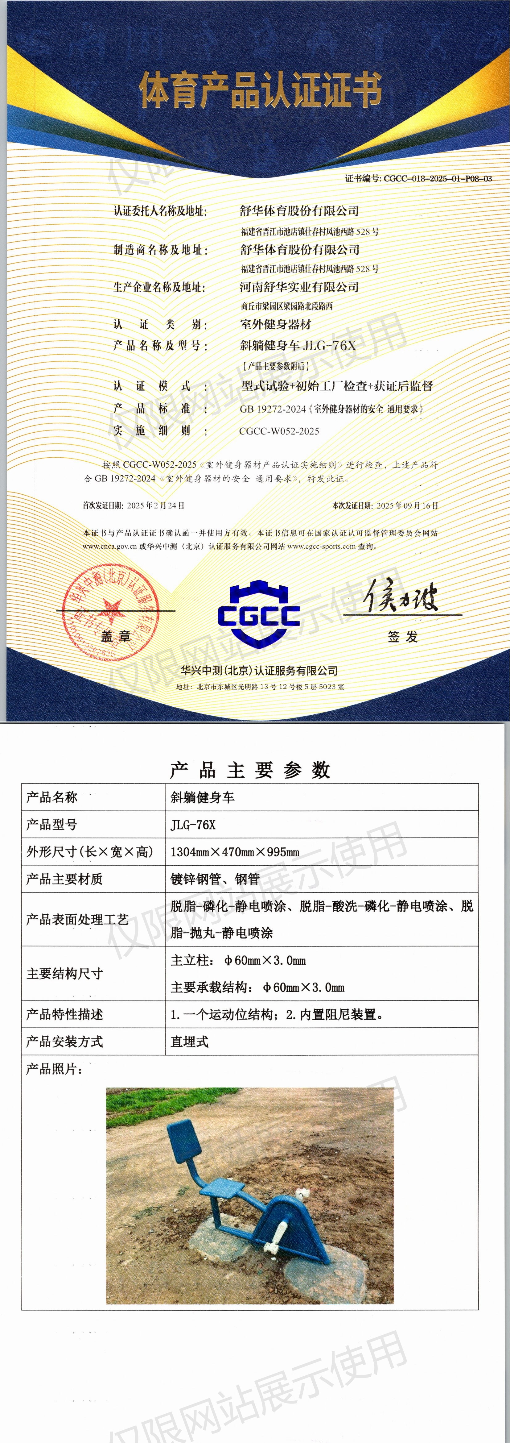 | 9 | 舒华体育股份有限公司 | CGCC-018-2025-01-P08-03 | 斜躺健身车 | JLG-76X | 商丘市梁园区梁园路北段路西 | GB 19272-2024 | 2025-02-24 | 有效 | 查看 |