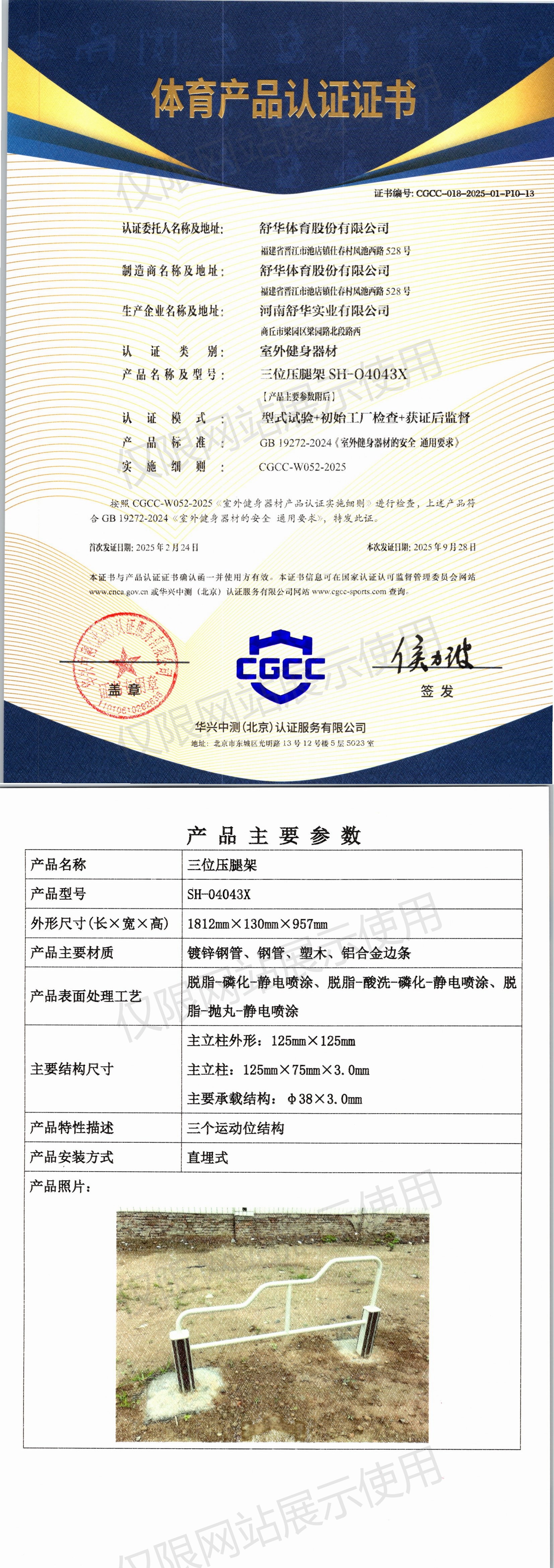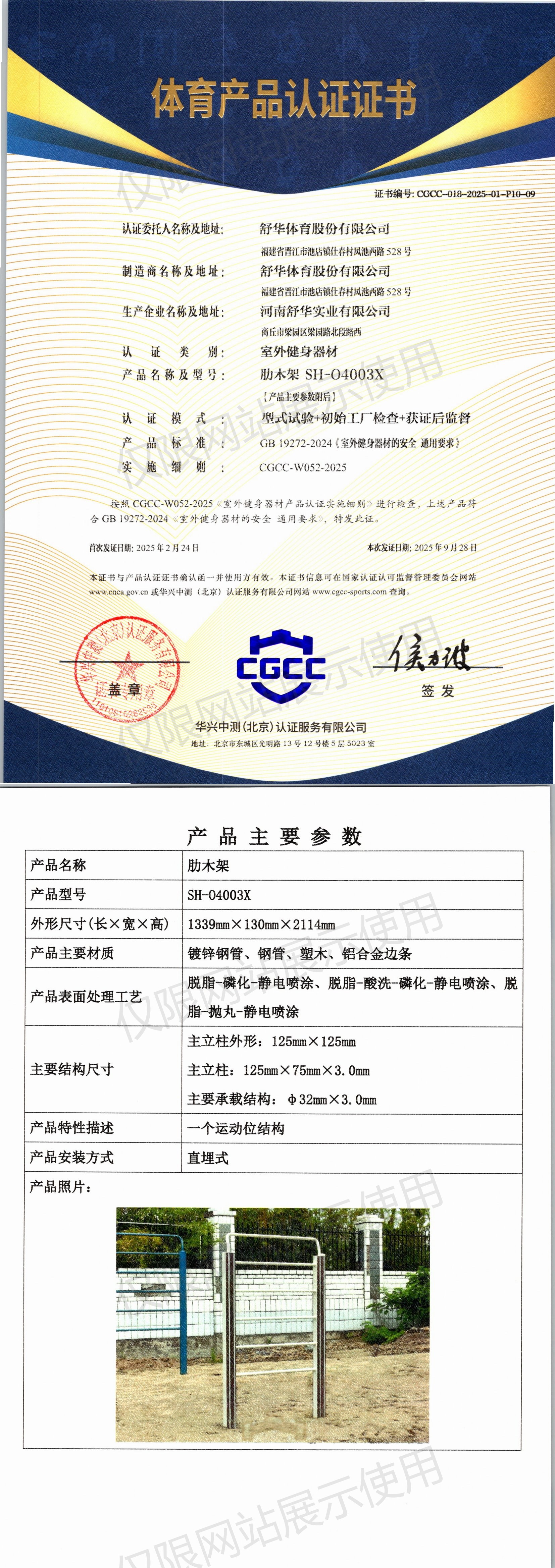 | 2 | 舒华体育股份有限公司 | CGCC-018-2025-01-P10-09 | 肋木架 | SH-O4003X | 商丘市梁园区梁园路北段路西 | GB 19272-2024 | 2025-02-24 | 有效 | 查看 |