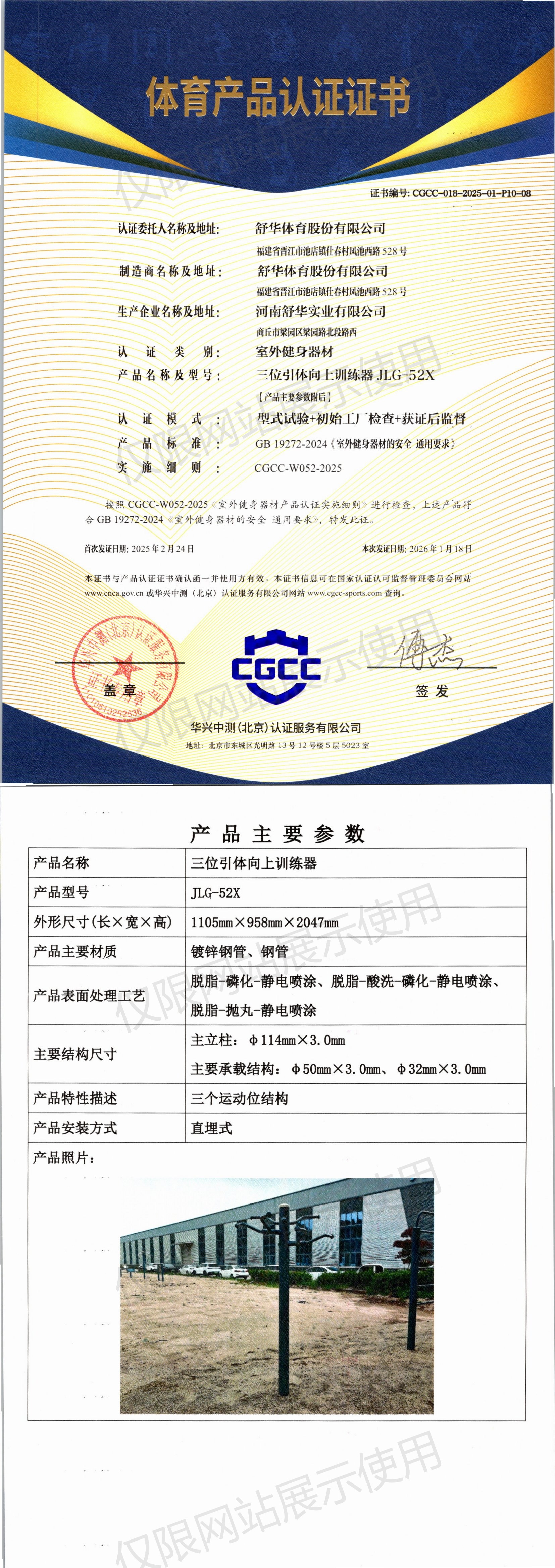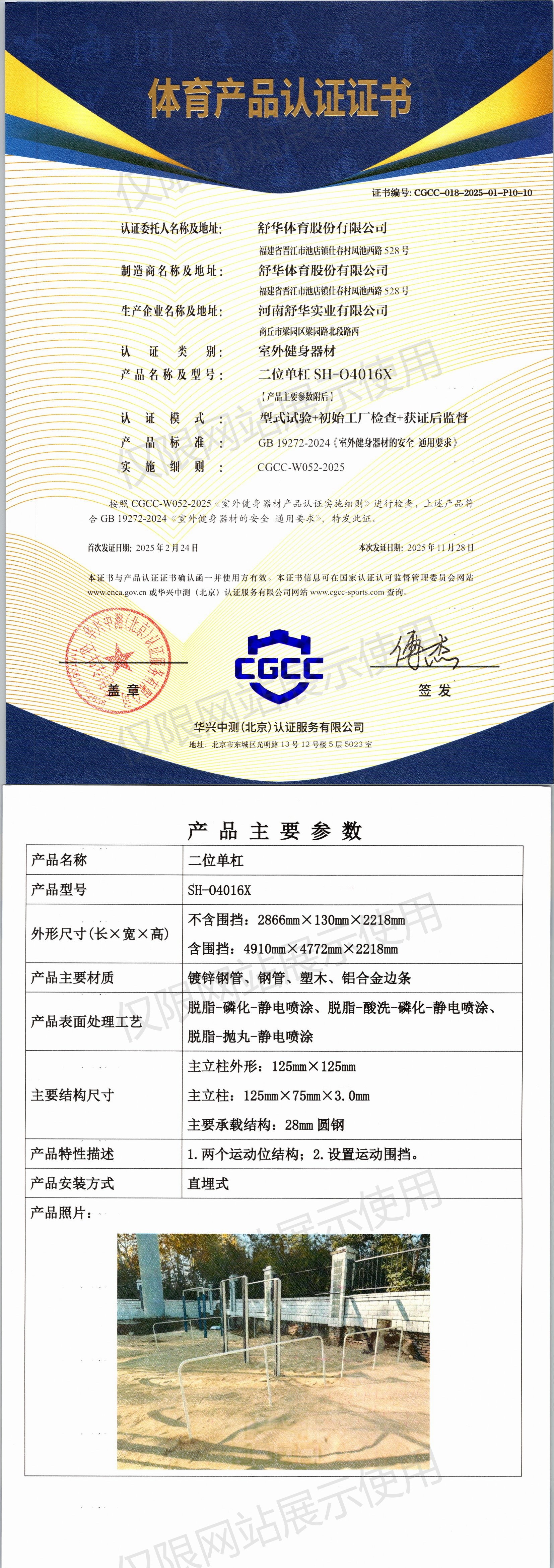 | 3 | 舒华体育股份有限公司 | CGCC-018-2025-01-P10-10 | 二位单杠 | SH-O4016X | 商丘市梁园区梁园路北段路西 | GB 19272-2024 | 2025-02-24 | 有效 | 查看 |