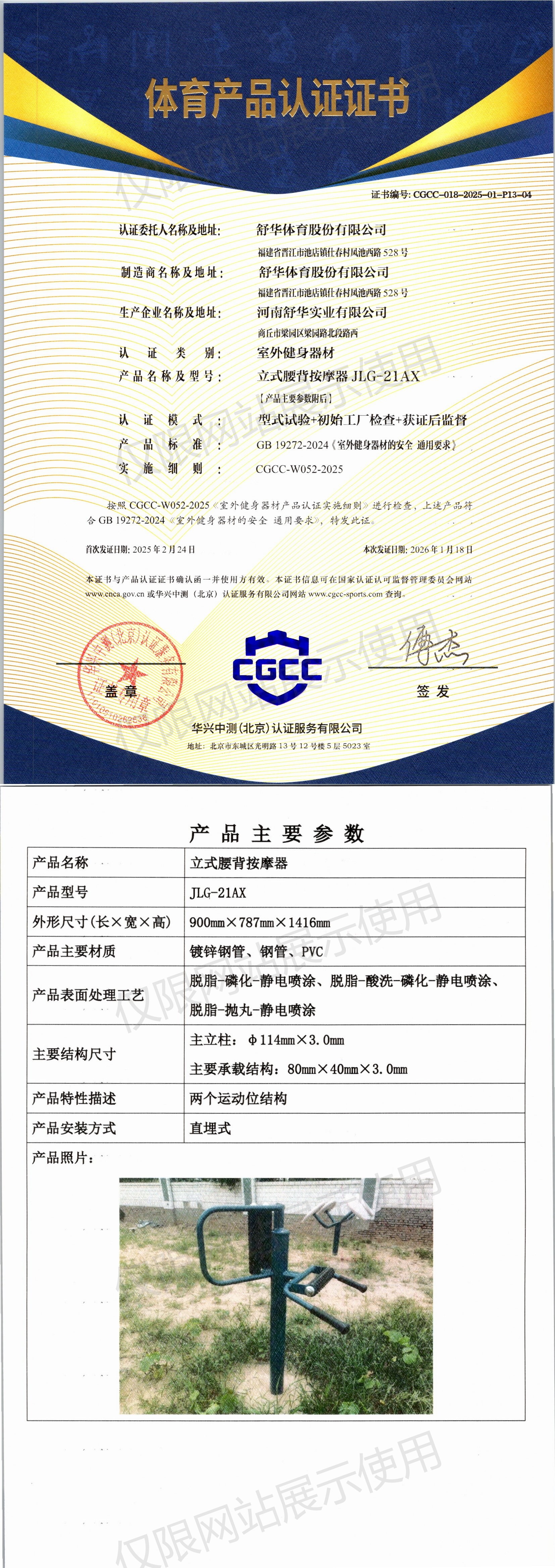 | 2 | 舒华体育股份有限公司 | CGCC-018-2025-01-P13-03 | 坐立式腰背按摩器 | JLG-21X | 商丘市梁园区梁园路北段路西 | GB 19272-2024 | 2025-02-24 | 有效 | 查看 |