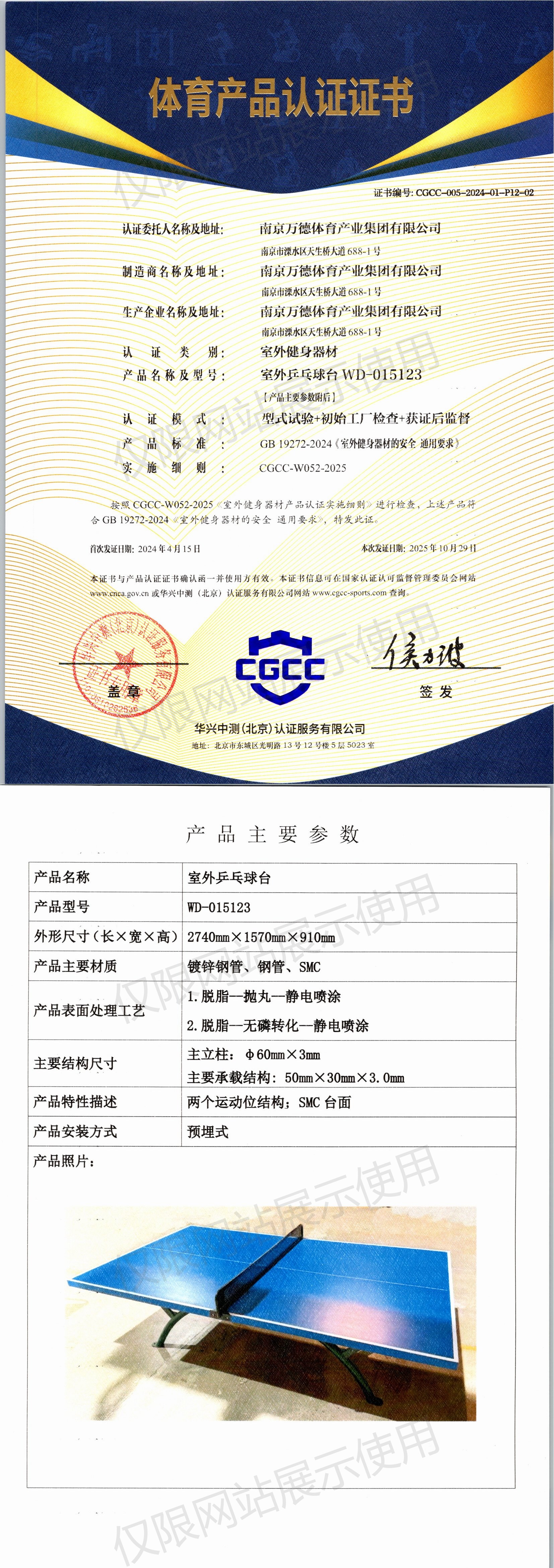 | 4 | 南京万德体育产业集团有限公司 | CGCC-005-2024-01-P12-01 | 室内乒乓球台 | WD-1006H1 | 南京市溧水区天生桥大道688-1号 | QBT 2700-2005 | 2024-04-15 | 有效 | 查看 |