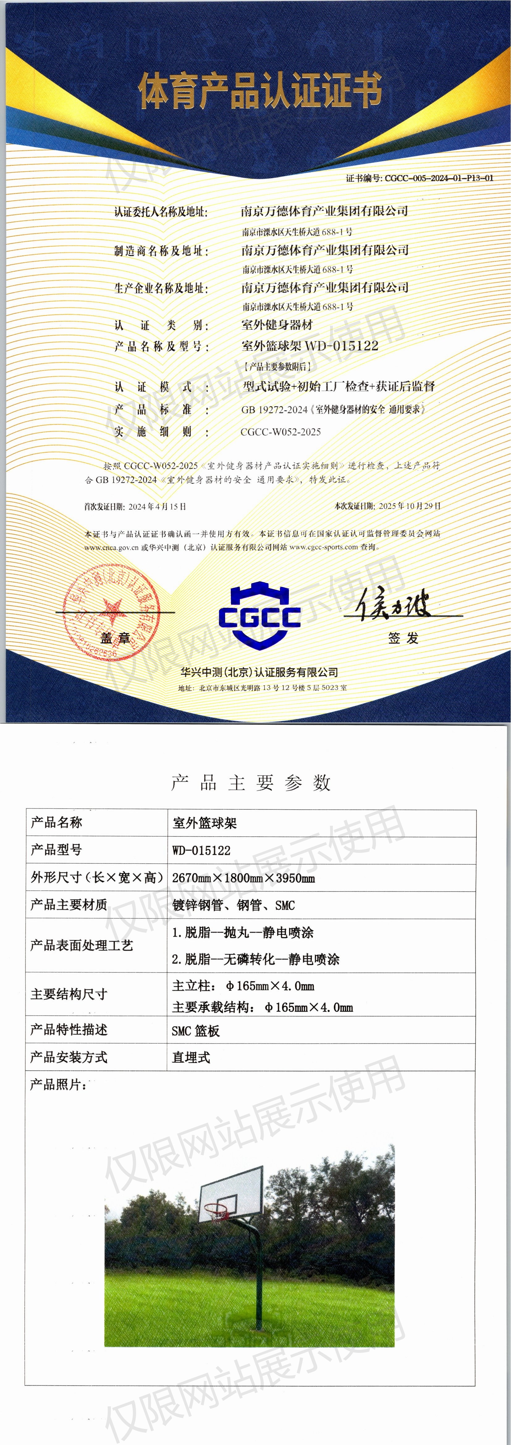 | 6 | 南京万德体育产业集团有限公司 | CGCC-005-2024-01-P13-01 | 室外篮球架 | WD-015122 | 南京市溧水区天生桥大道688-1号 | GB 19272-2024 | 2024-04-15 | 有效 | 查看 |