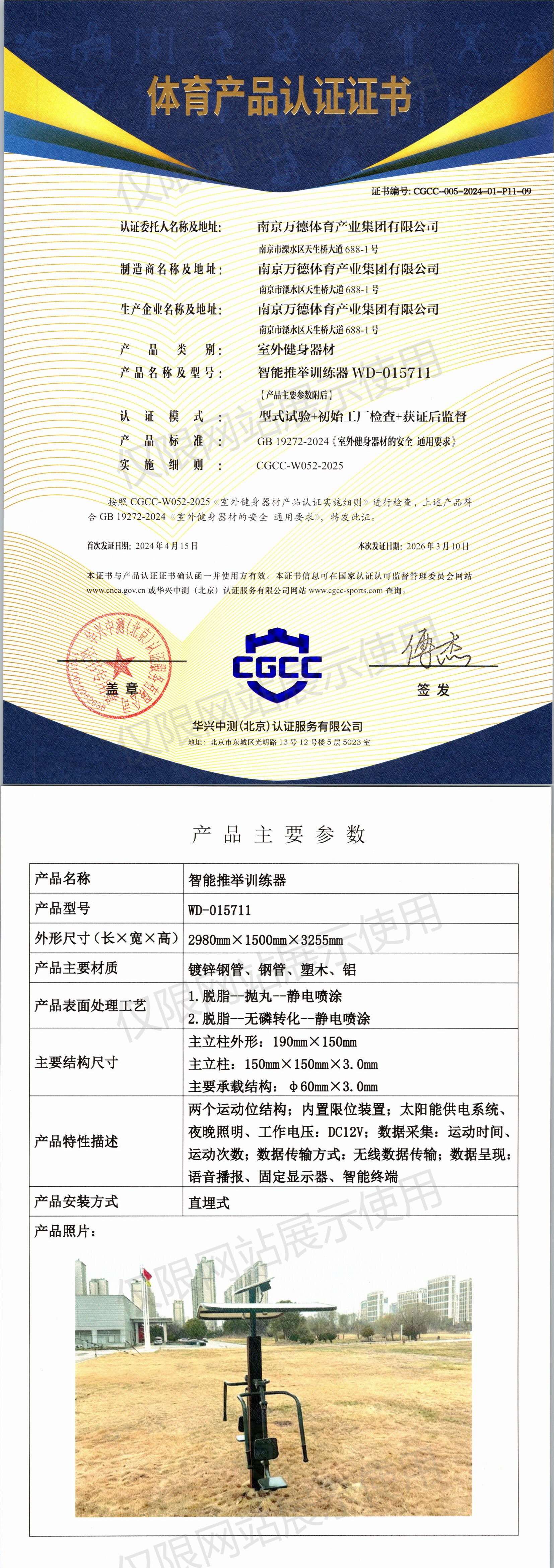 | 3 | 南京万德体育产业集团有限公司 | CGCC-005-2024-01-P11-09 | 智能推举训练器 | WD-015711 | 南京市溧水区天生桥大道688-1号 | GB 19272-2024 | 2024-04-15 | 有效 | 查看 |