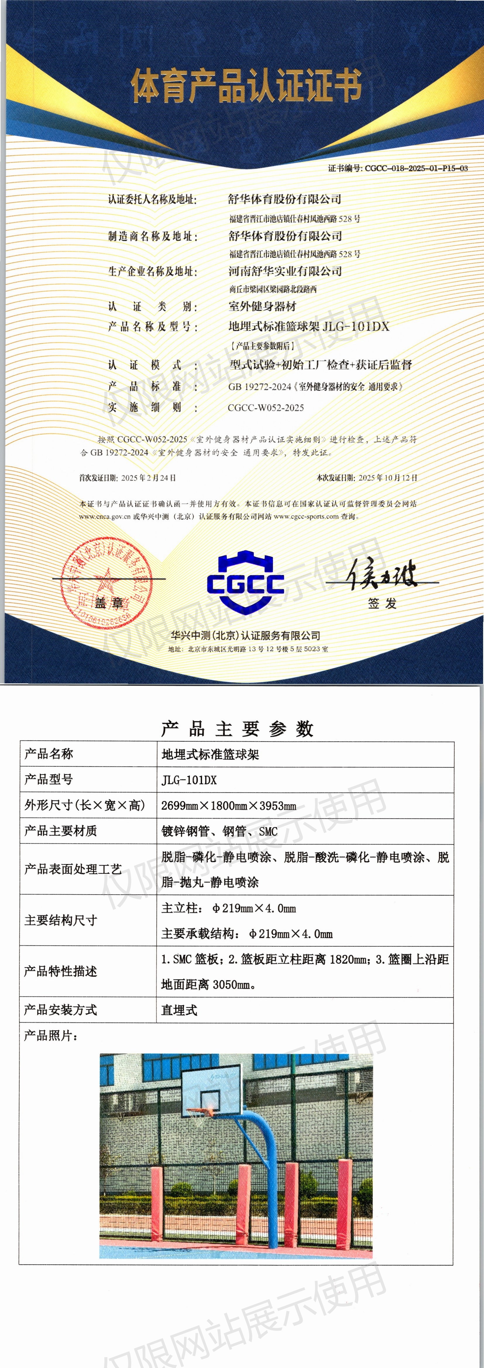 | 2 | 舒华体育股份有限公司 | CGCC-018-2025-01-P15-03 | 地埋式标准篮球架 | JLG-101DX | 商丘市梁园区梁园路北段路西 | GB 19272-2024 | 2025-02-24 | 有效 | 查看 |