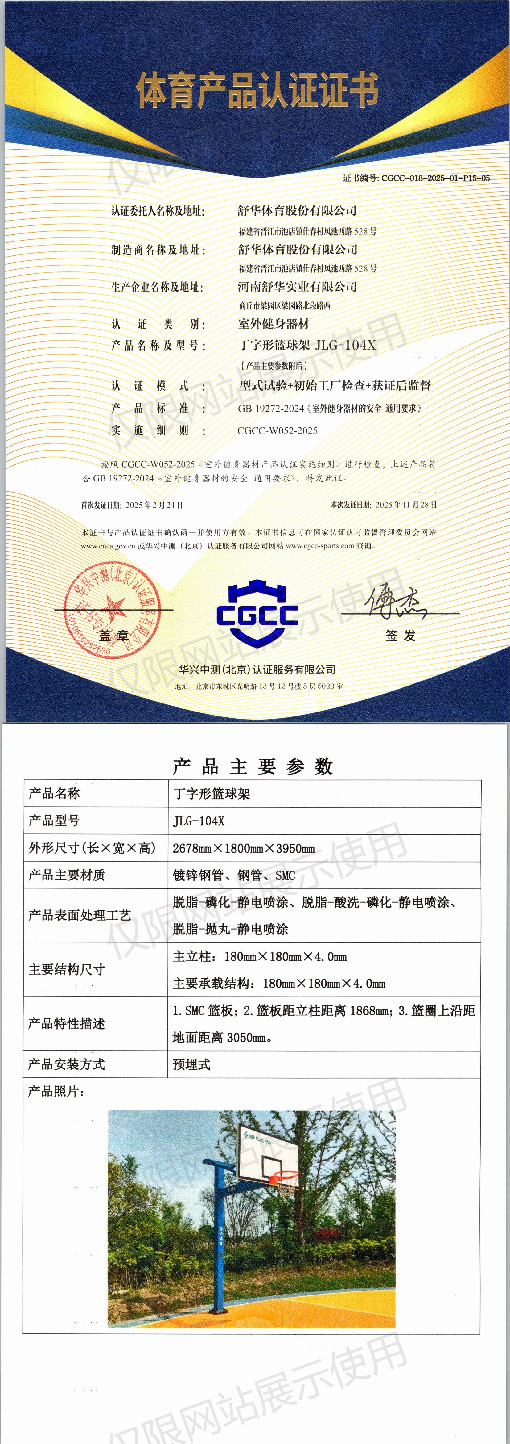 | 4 | 舒华体育股份有限公司 | CGCC-018-2025-01-P15-05 | 丁字形篮球架 | JLG-104X | 商丘市梁园区梁园路北段路西 | GB 19272-2024 | 2025-02-24 | 有效 | 查看 |