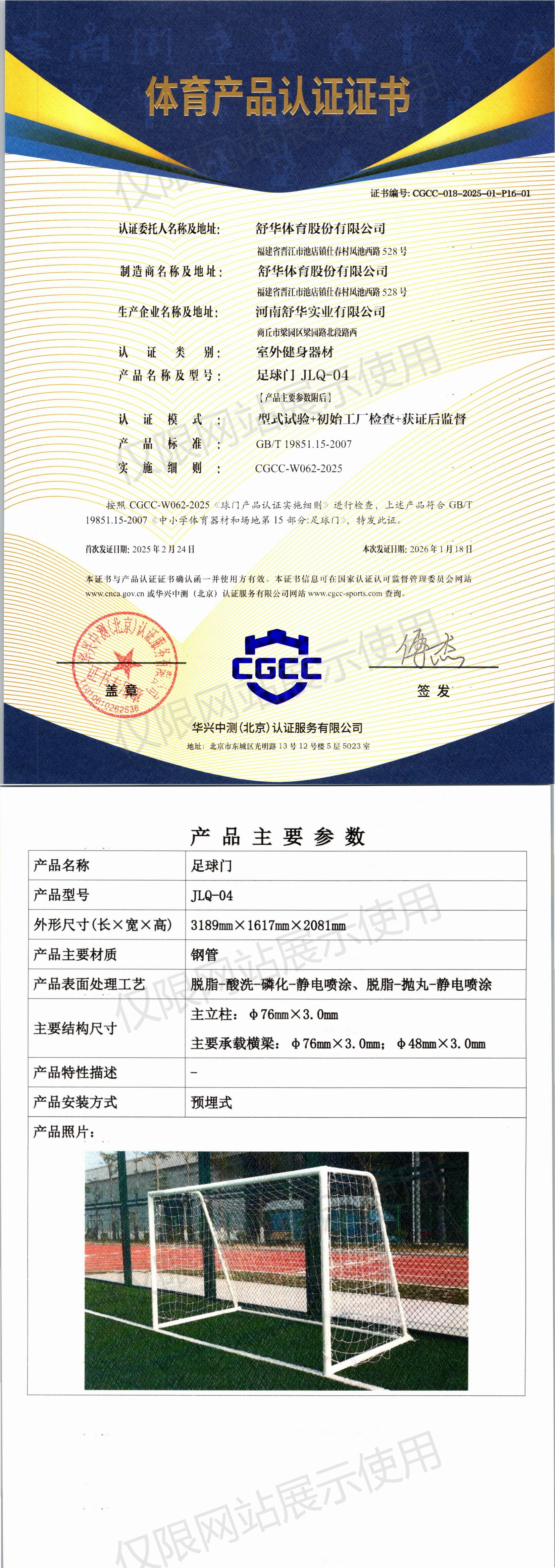 | 5 | 舒华体育股份有限公司 | CGCC-018-2025-01-P16-01 | 足球门 | JLQ-04 | 商丘市梁园区梁园路北段路西 | GB/T 19851.15-2007 | 2025-02-24 | 有效 | 查看 |