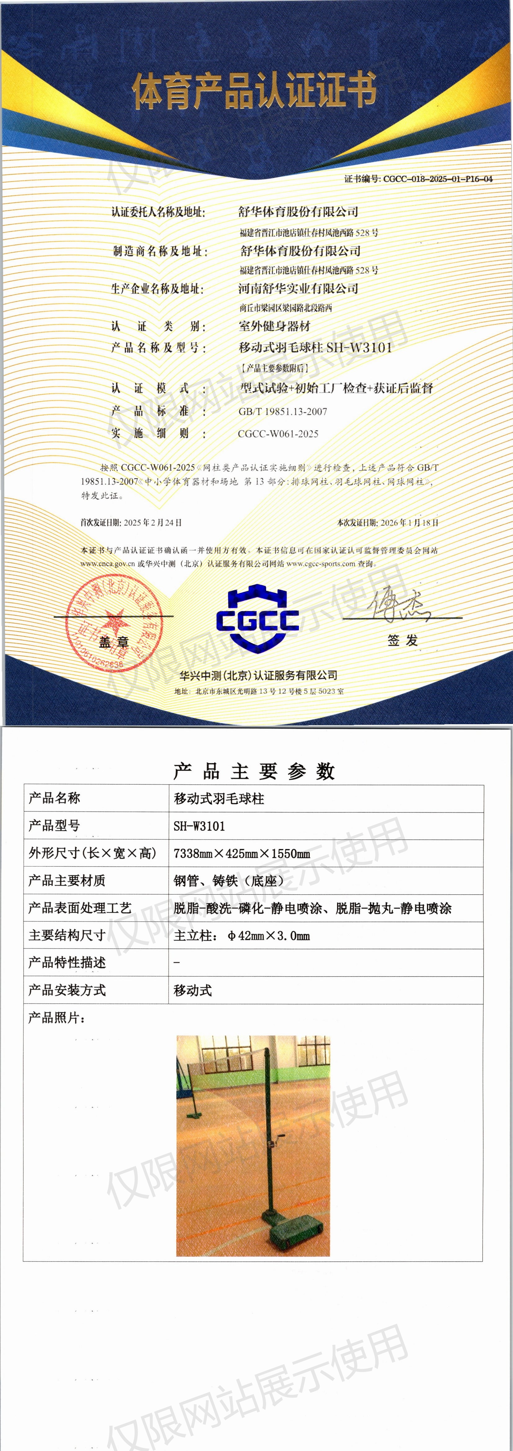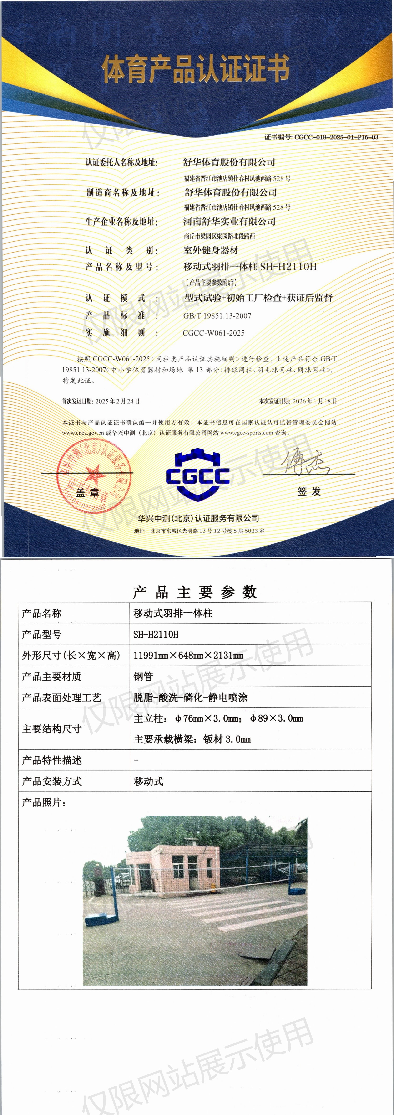 | 7 | 舒华体育股份有限公司 | CGCC-018-2025-01-P16-03 | 移动式羽排一体柱 | SH-H2110H | 商丘市梁园区梁园路北段路西 | GB/T 19851.13-2007 | 2025-02-24 | 有效 | 查看 |
