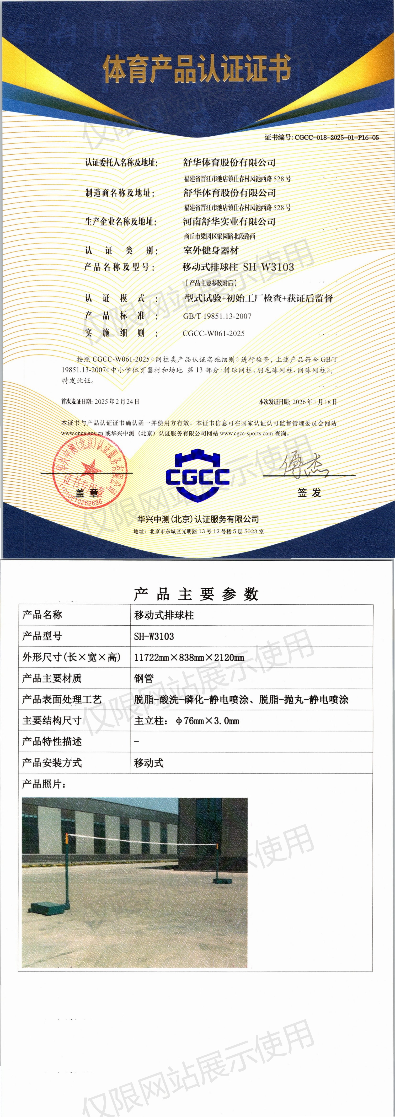 | 9 | 舒华体育股份有限公司 | CGCC-018-2025-01-P16-05 | 移动式排球柱 | SH-W3103 | 商丘市梁园区梁园路北段路西 | GB/T 19851.13-2007 | 2025-02-24 | 有效 | 查看 |