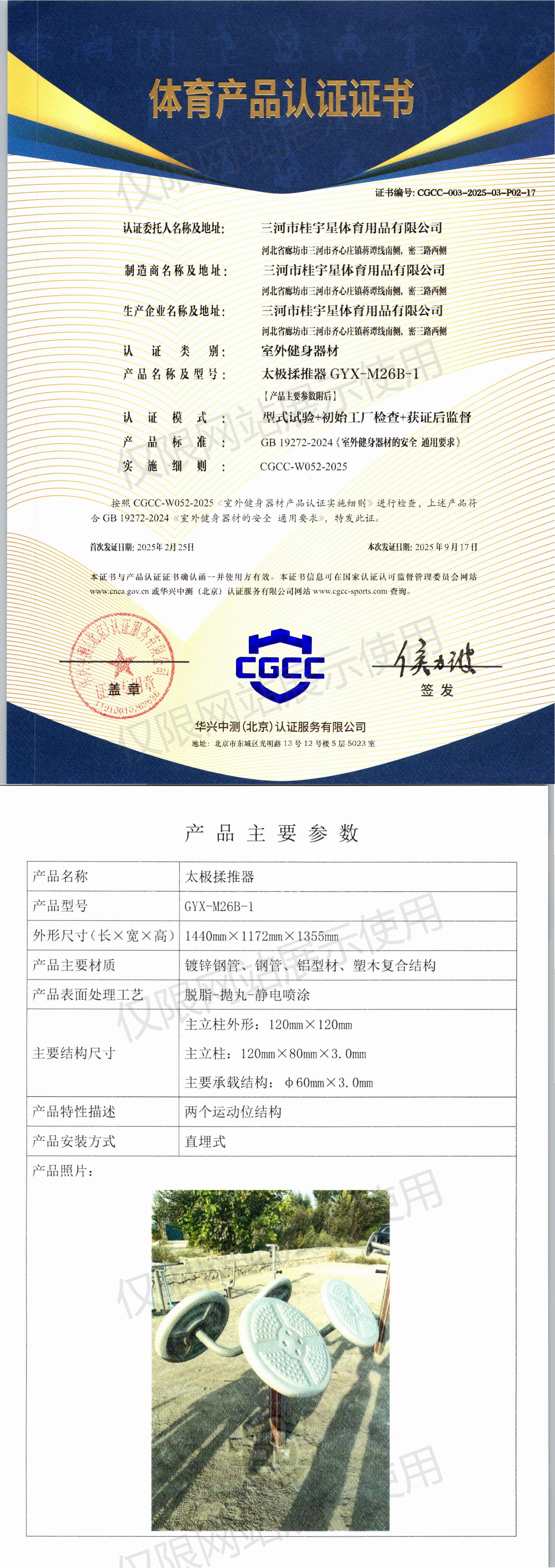 | 6 | 三河市桂宇星体育用品有限公司 | CGCC-003-2025-03-P02-17 | 太极揉推器 | GYX-M26B-1 | 河北省廊坊市三河市齐心庄镇蒋谭线南侧,密三路西侧 | GB 19272-2024 | 2025-02-25 | 有效 | 查看 |
