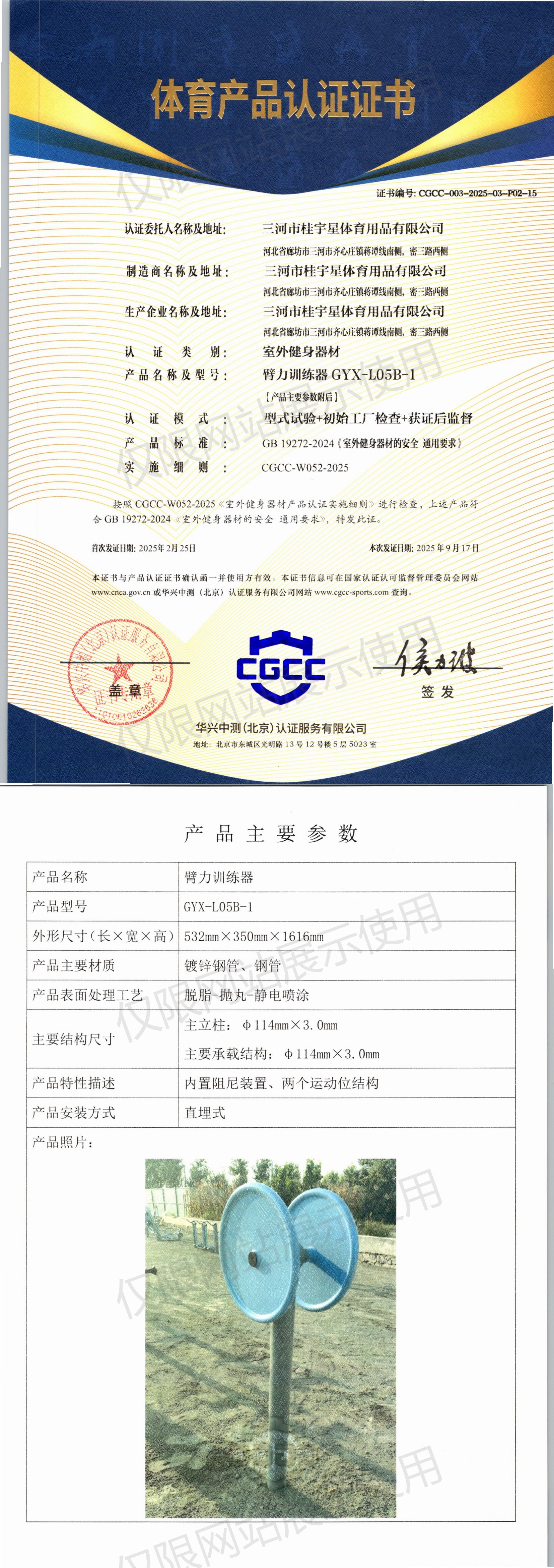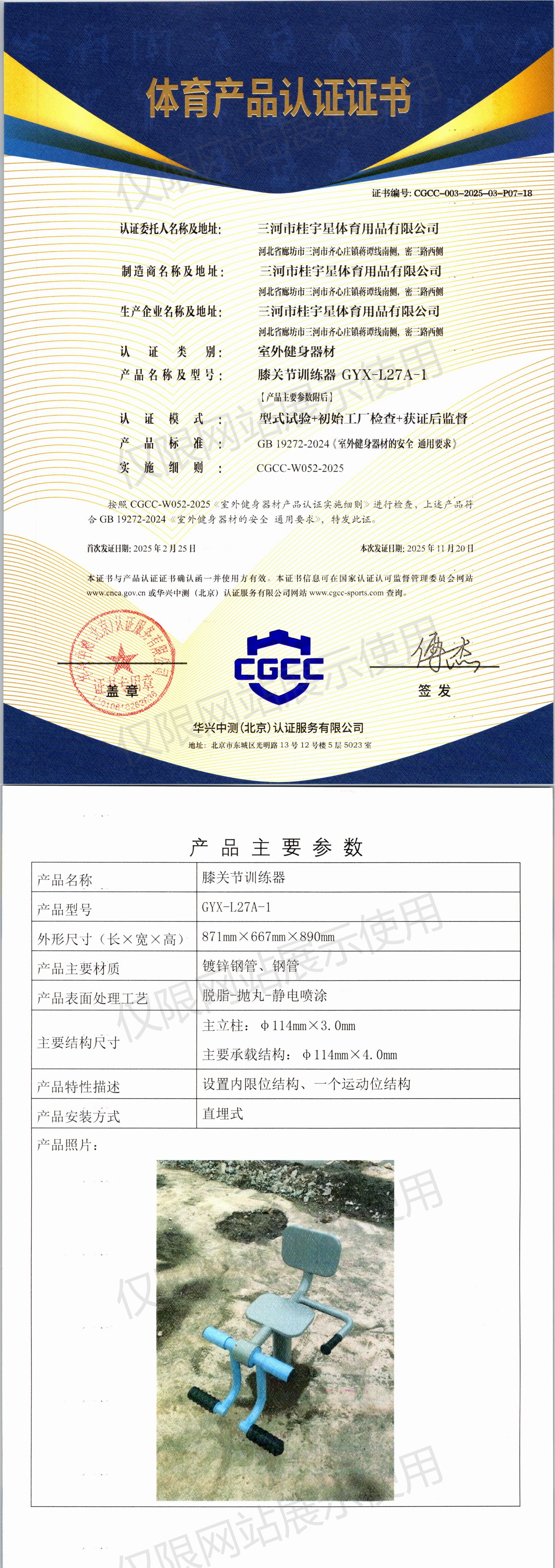 | 5 | 三河市桂宇星体育用品有限公司 | CGCC-003-2025-03-P02-16 | 俯卧压腿组合器 | GYX-L110 | 河北省三河市齐心庄镇小邢庄村东 | GB19272-2011 | 2025-02-25 | 有效 | 查看 |
